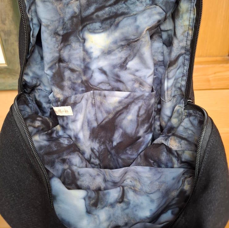 Sturdy backpack in black denim, with grey textured velvet panel. Zipped front pocket, zipped main compartment lined in batik cotton in shades of grey, with inside pocket. Adjustable cotton webbing straps and loop.
