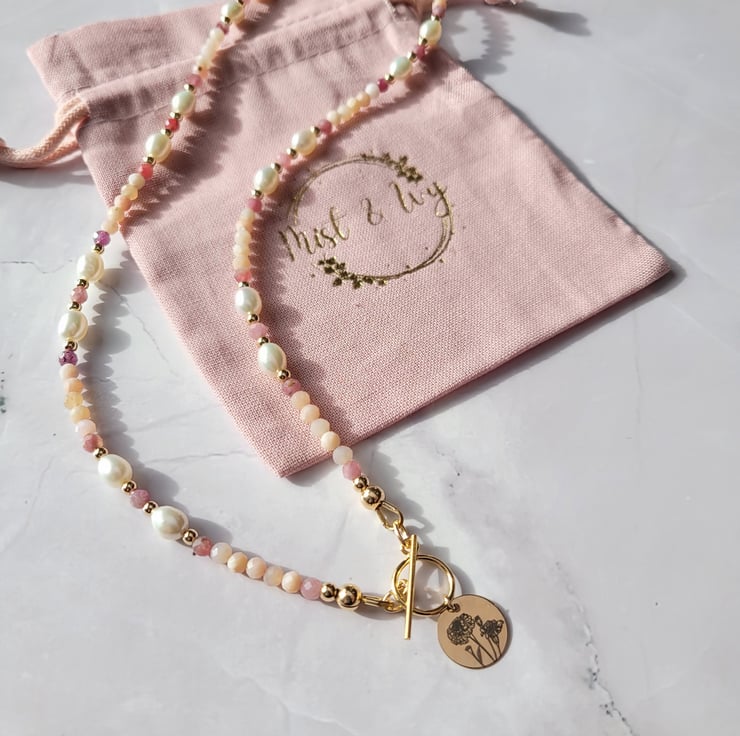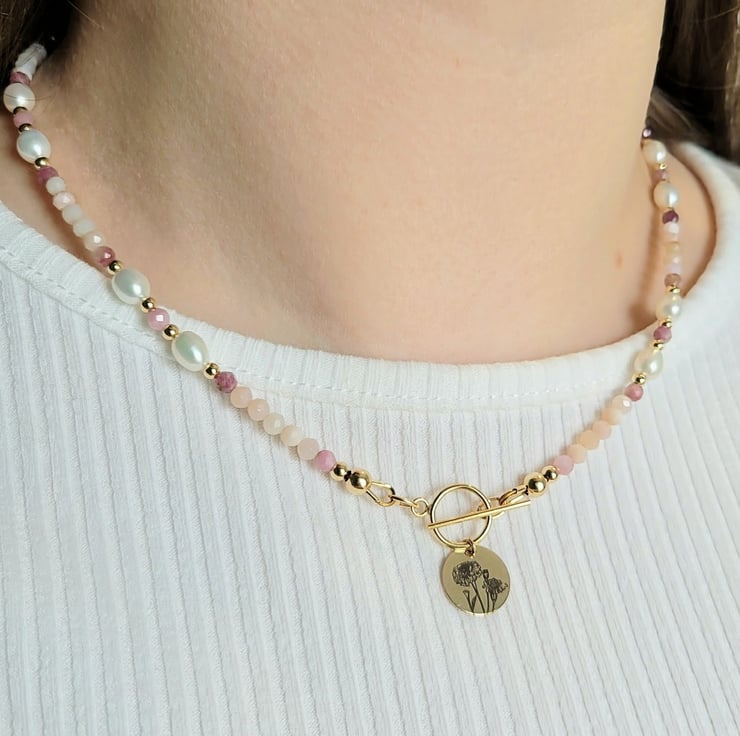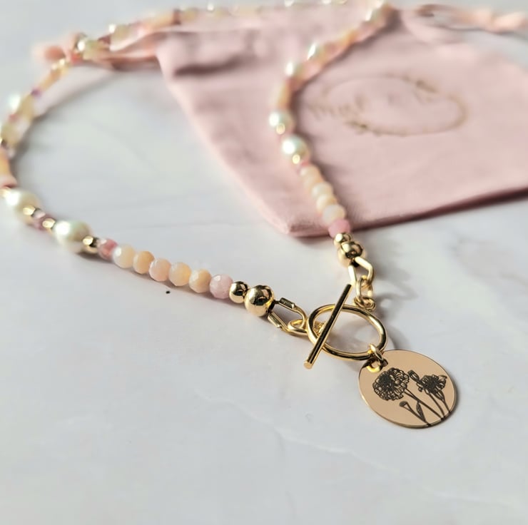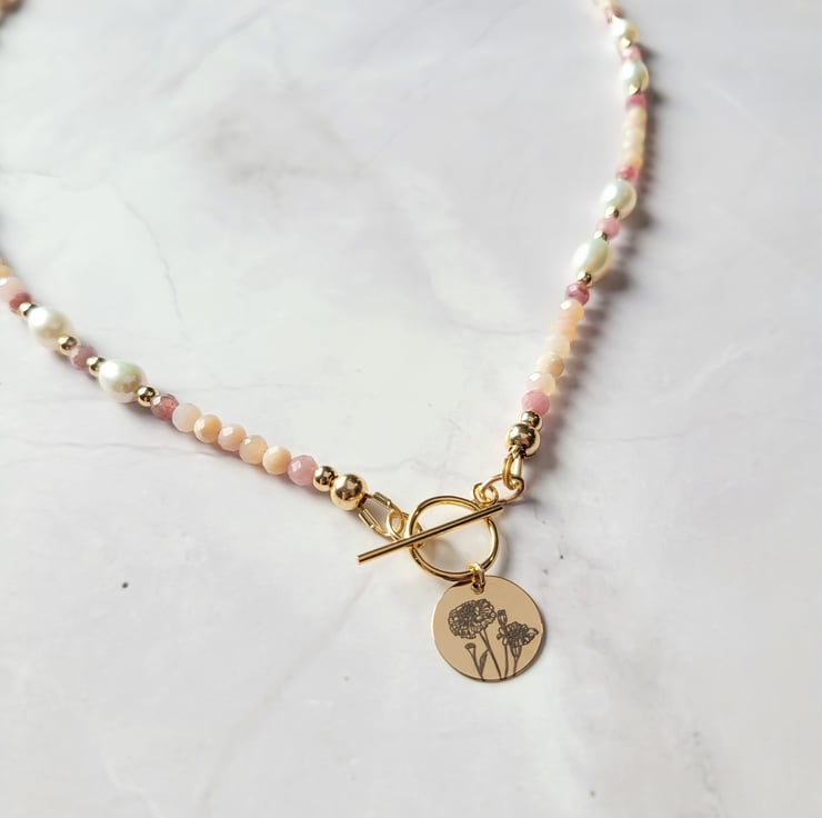 This beautiful gemstone necklace features the October birth flower (marigold) and both of the October birthstones (opal and tourmaline). The main gemstone is pink opal, and the freshwater pearls are accentuated by small gold filled beads, and pink tourmaline. It fastens at the front with a 14kt gold filled toggle clasp. Attached to the clasp is a pretty charm featuring the marigold flower.
