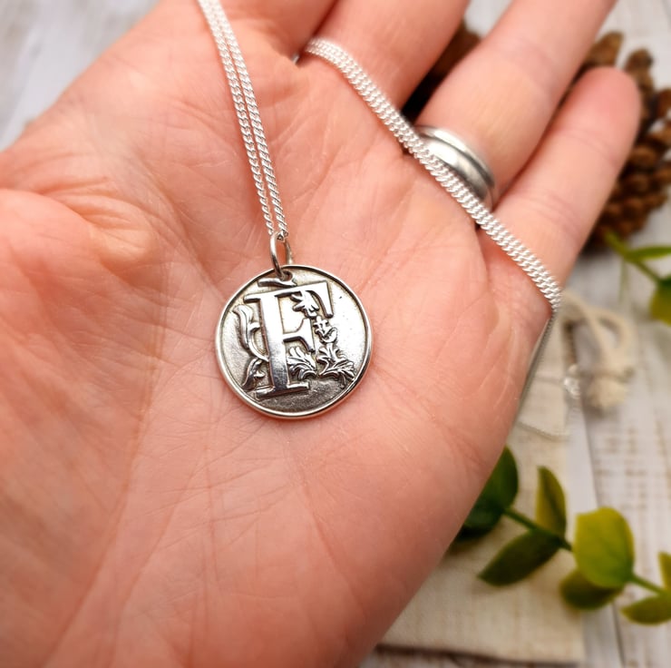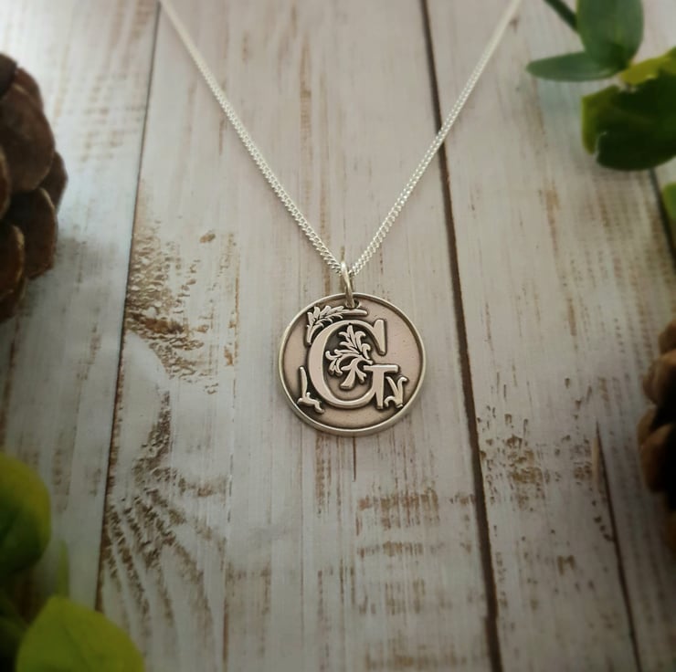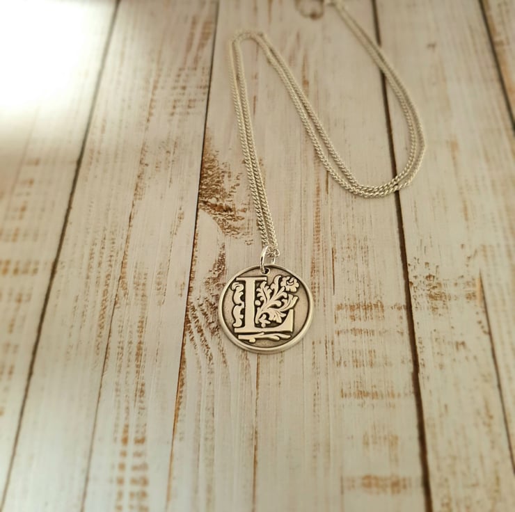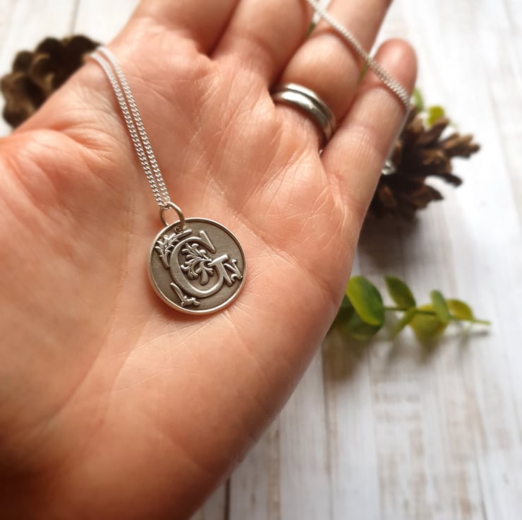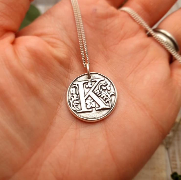 This stunning, large ornate wax seal stamp initial pendant is handmade in pure silver and features the letter of your choice. Your chosen initial is surrounded by a flourish of floral detail and made using an authentic wax seal stamp. This handcrafted wax seal pendant has been completed in a brushed silver finish and antiqued for that classic vintage look. A real statement piece! These make a gorgeous personalised gift for that special someone or even just as a stunning necklace for yourself. Handmade, meaningful, unique! You also have the option of choosing a 50cm or 60cm sterling silver curb chain to complete the pendant, and adding up to three charms.