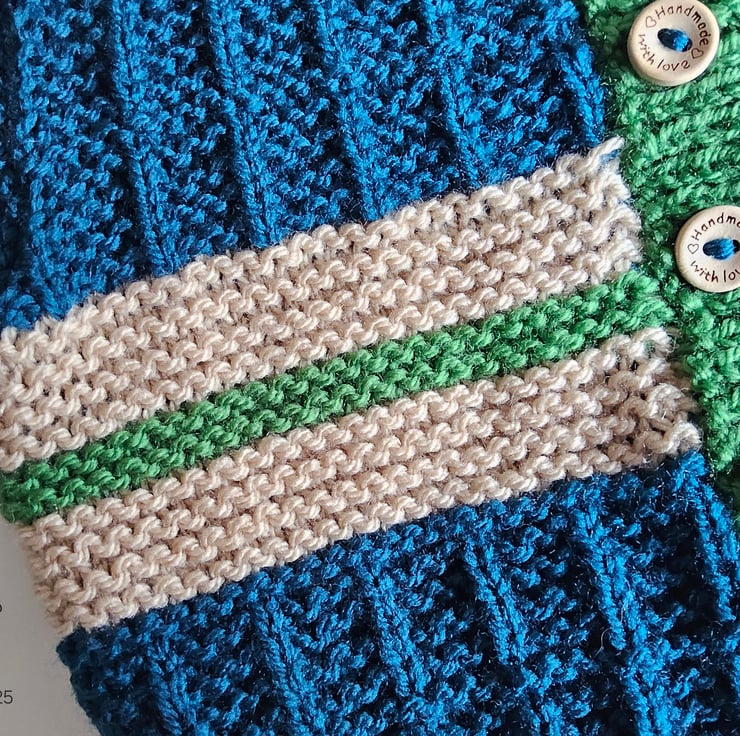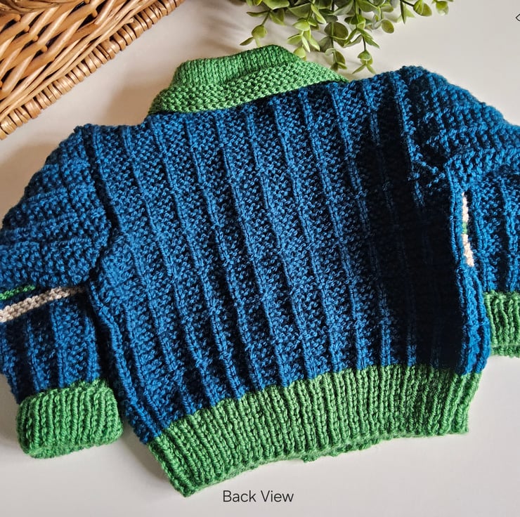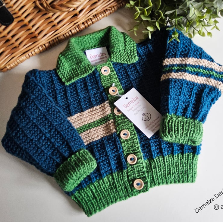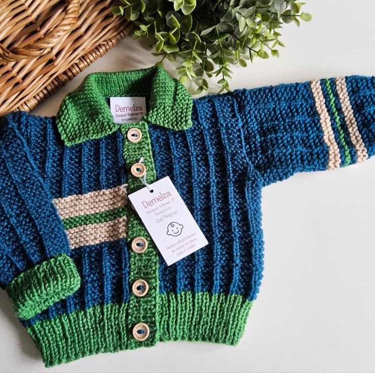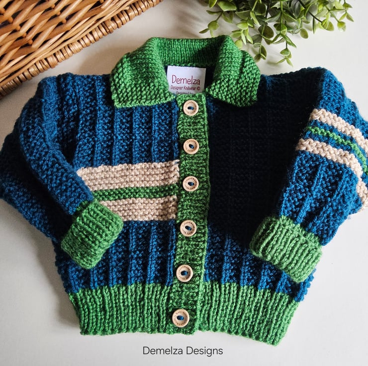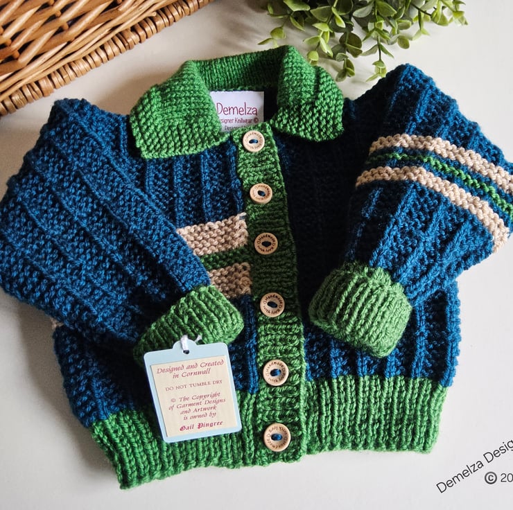 This cosy warm baby cardigan has been lovingly designed and hand crafted in Cornwall using quality branded premium machine washable acylic yarns. The colours are very trendy to go with any baby boys wardrobe collection.