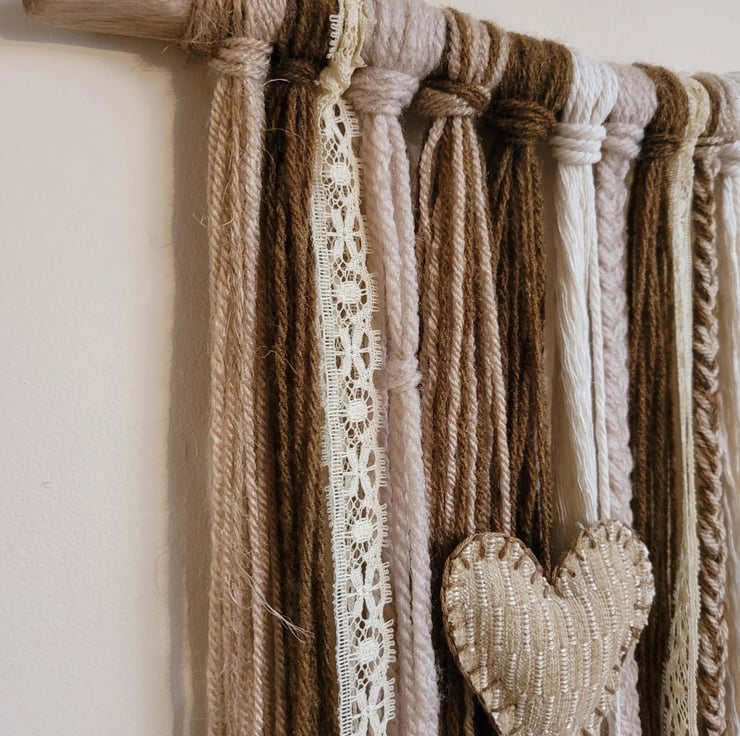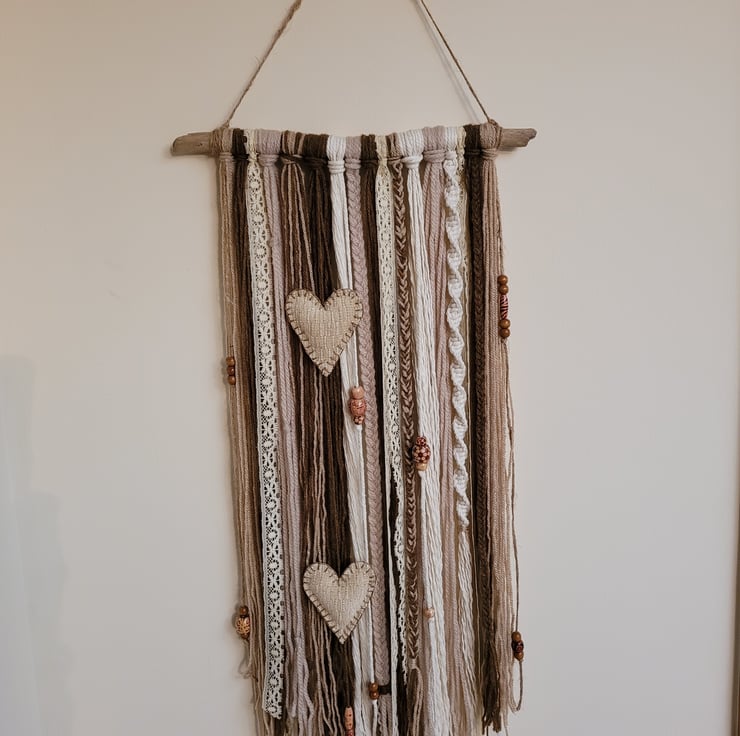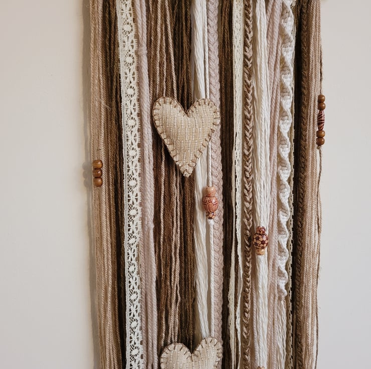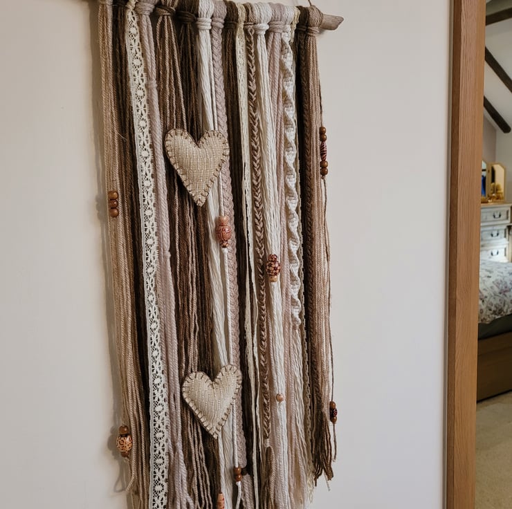 I've tied various different yarns, lace, macrame & wooden beads to create this gorgeous piece, that would look great in any room. There are two hand stitched padded fabric hearts incorporated into it.