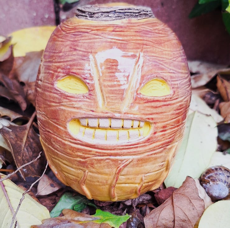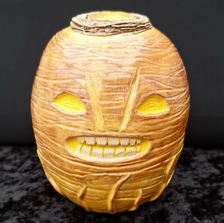 Tarquin is an earthenware ceramic decorative carved turnip head/Jack 'O' Lantern. He is glazed in authentic glossy turnip/swede colours with bright eyes as if lit from inside. Tarquin would make the perfect companion for your Celtic Samhain celebrations! He is one of a kind.
