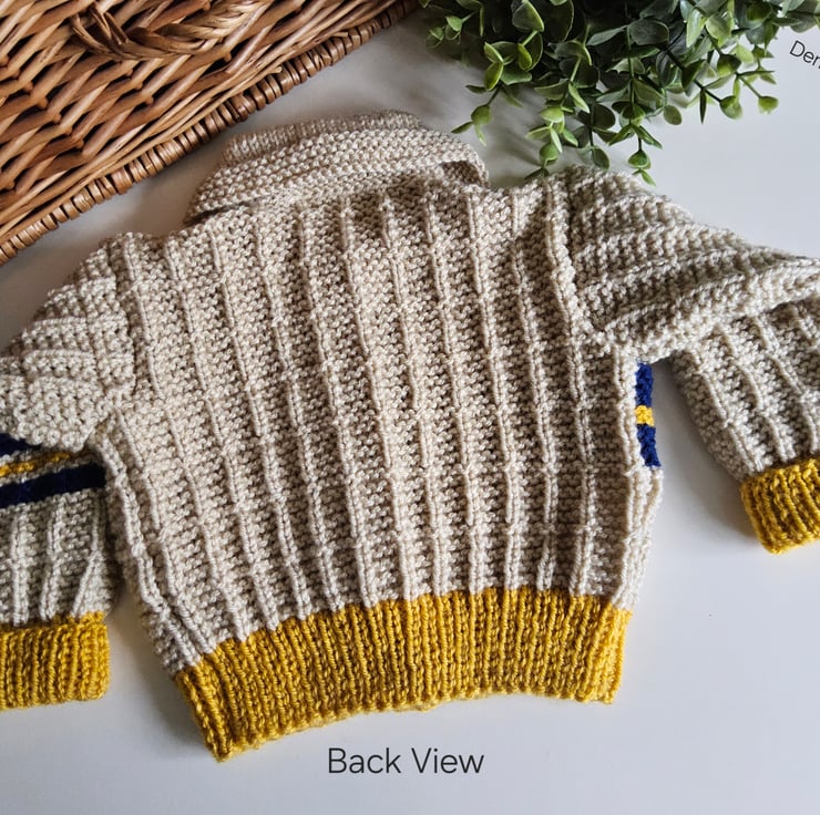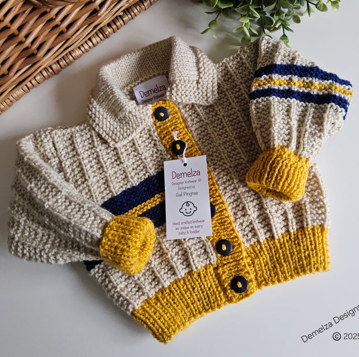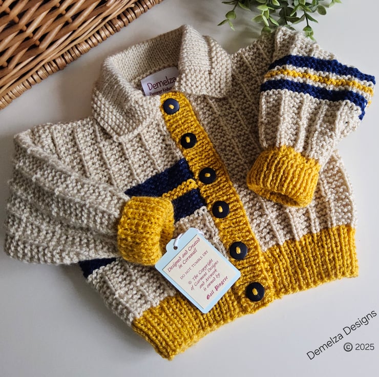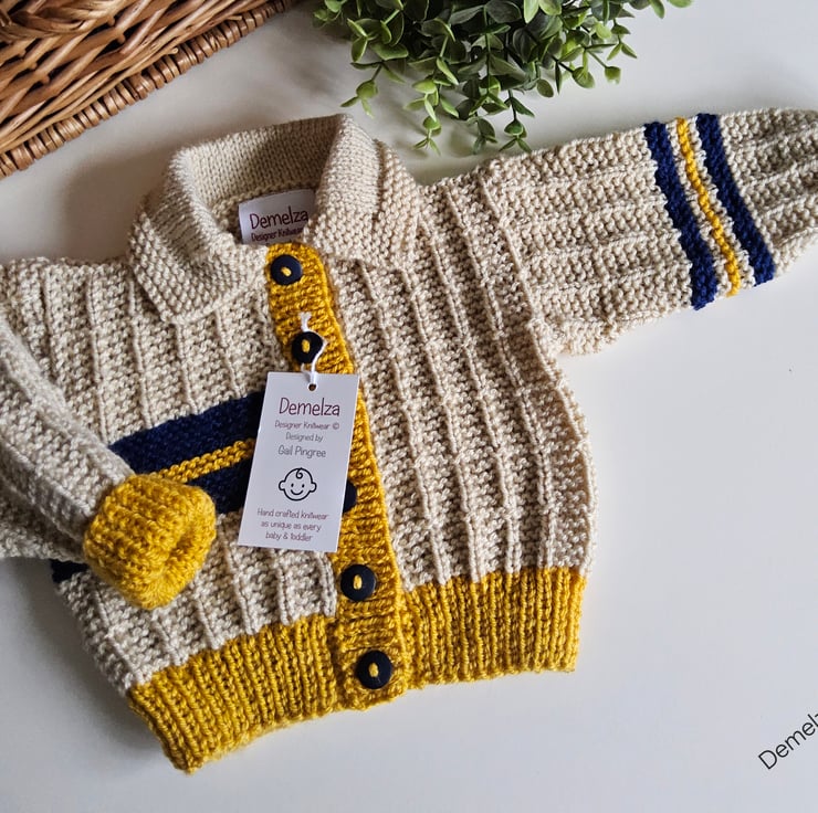 This cosy warm baby cardigan has been lovingly designed and hand crafted in Cornwall using quality branded premium machine washable acylic yarns. The colours are very trendy to go with any baby boys wardrobe collection.