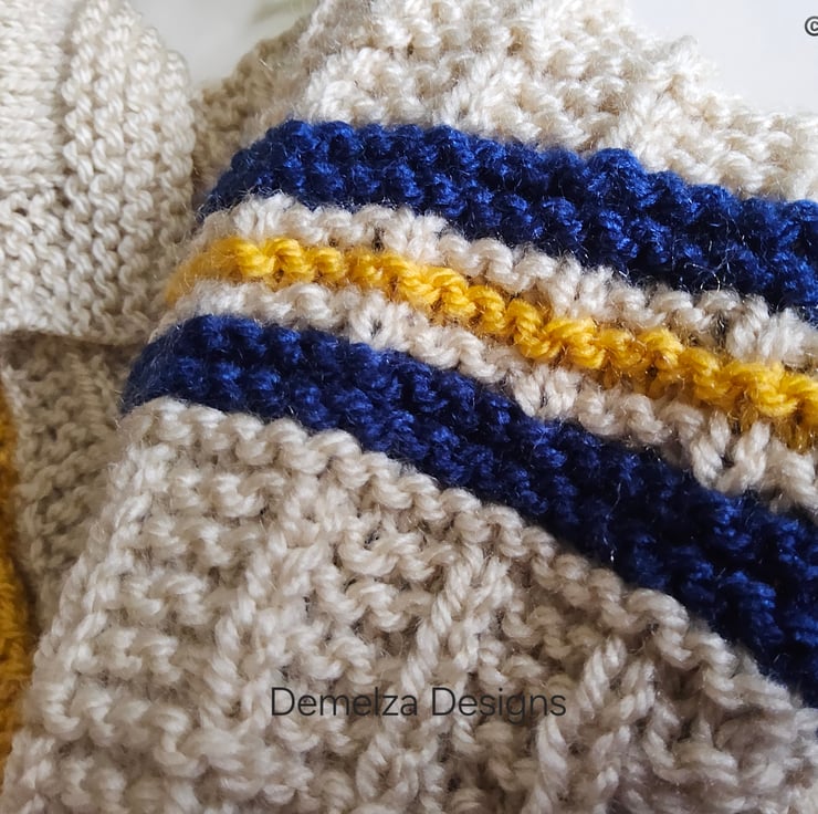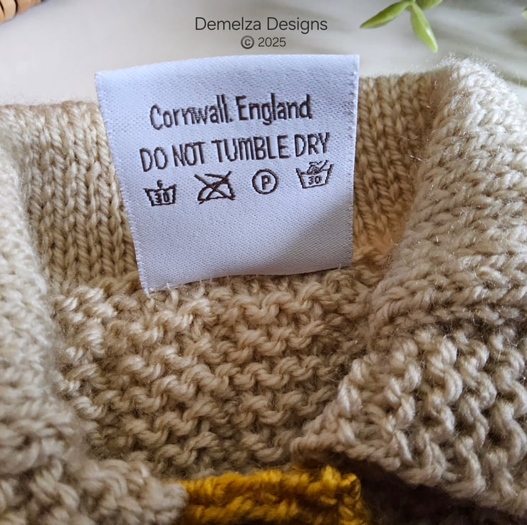 Baby knitwear is designed and hand crafted by Demelza Designs in Cornwall meeting UK baby safety standards, Only branded premuim acylic, acrylic/natural fibre blends or pure natural fibre yarns are used in baby knitwear which conforms to BS984/76 standards.