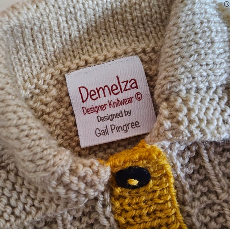 On the cardigan back neck the branded luxurious woven damask Demelza Designs garment label has the care instructions woven within it on the reverse side for lasting reference. Prior to dispatch a branded Demelza Designs garment swing tag will be attached to the front providing a professional touch, especially if gifting.