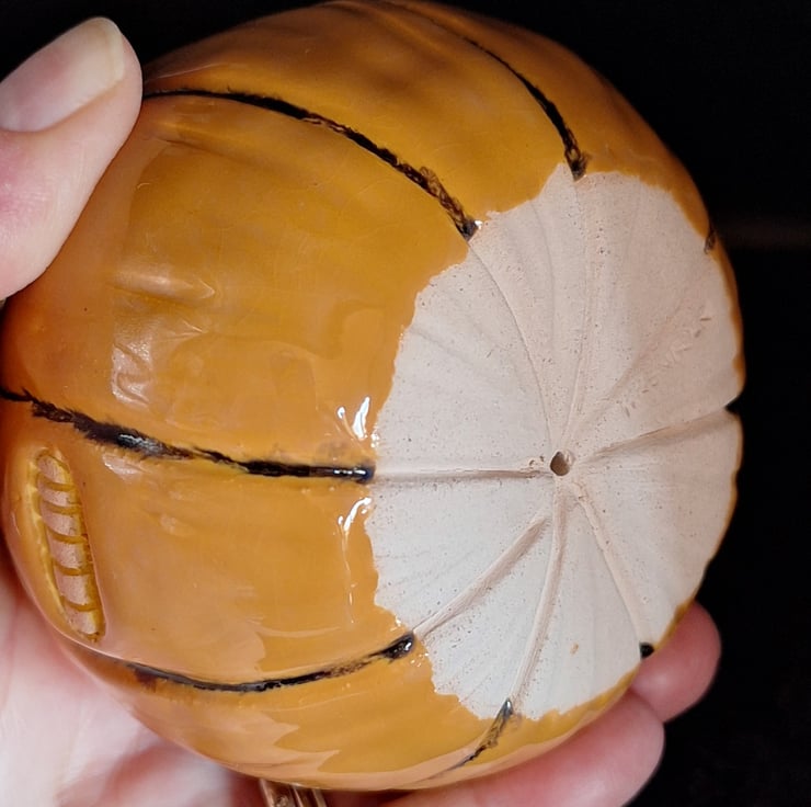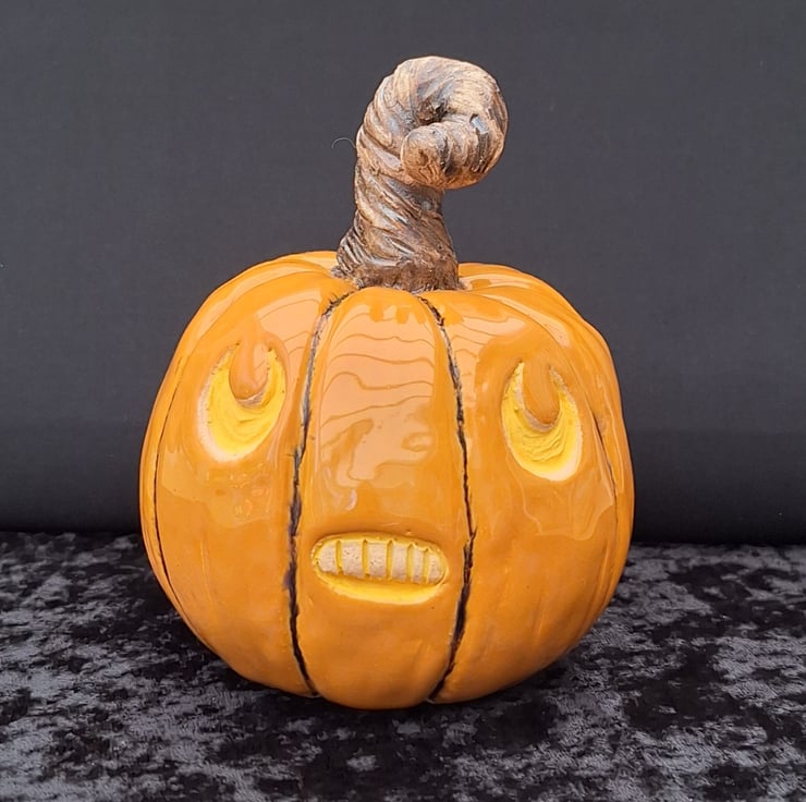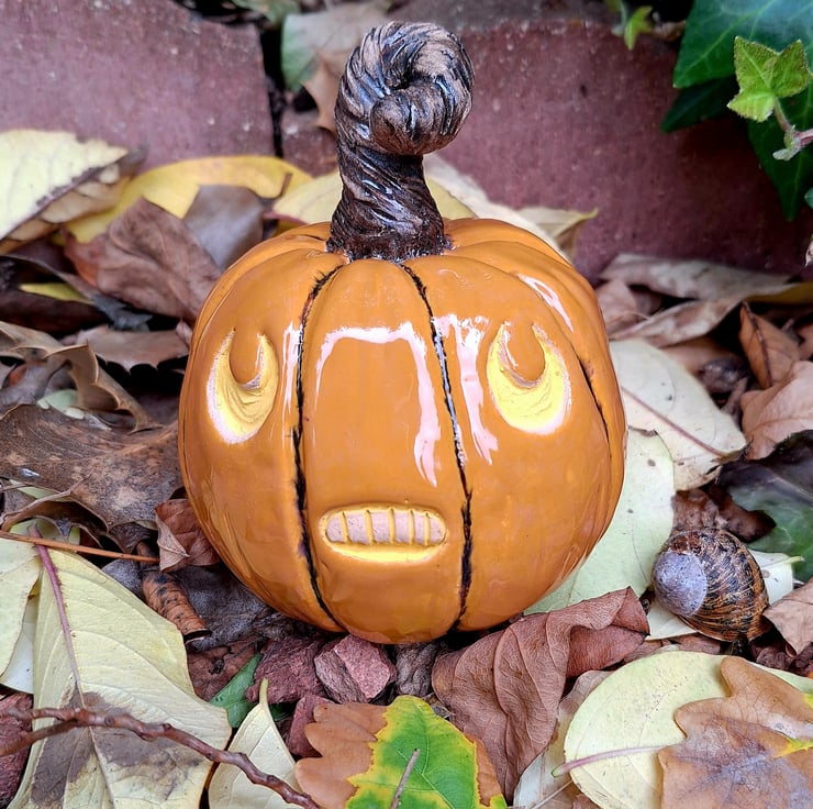 Patrick is an earthenware ceramic decorative carved pumpkin/Jack 'O' Lantern. He is glazed in a beautiful glossy pumpkin colour with bright eyes as if lit from inside. He has an authentic looking curly stalk. Patrick would make the perfect companion for your Celtic Samhain/Halloween celebrations! He is one of a kind.