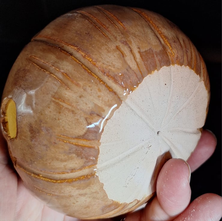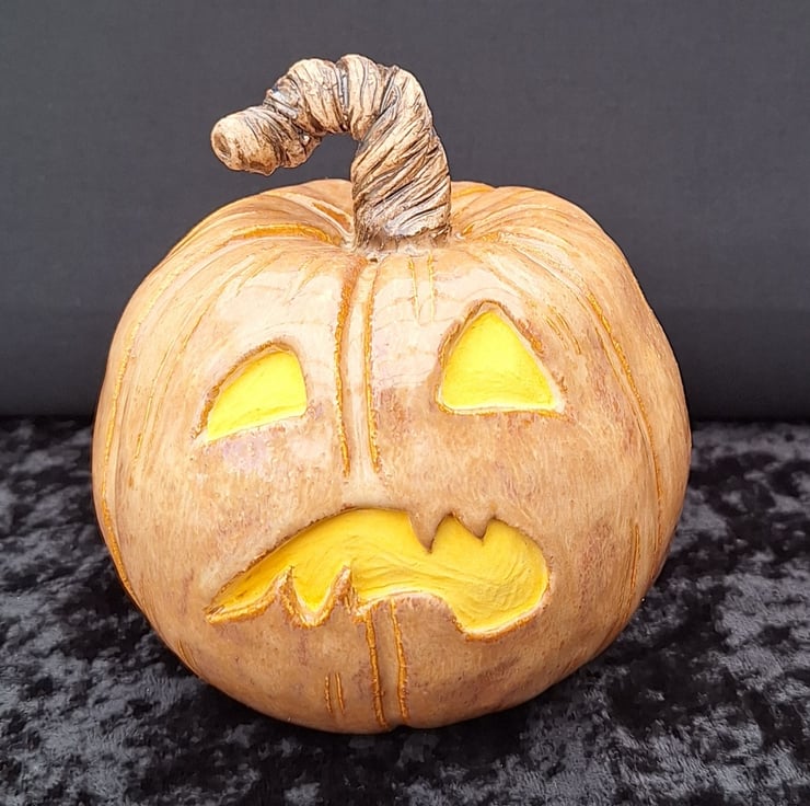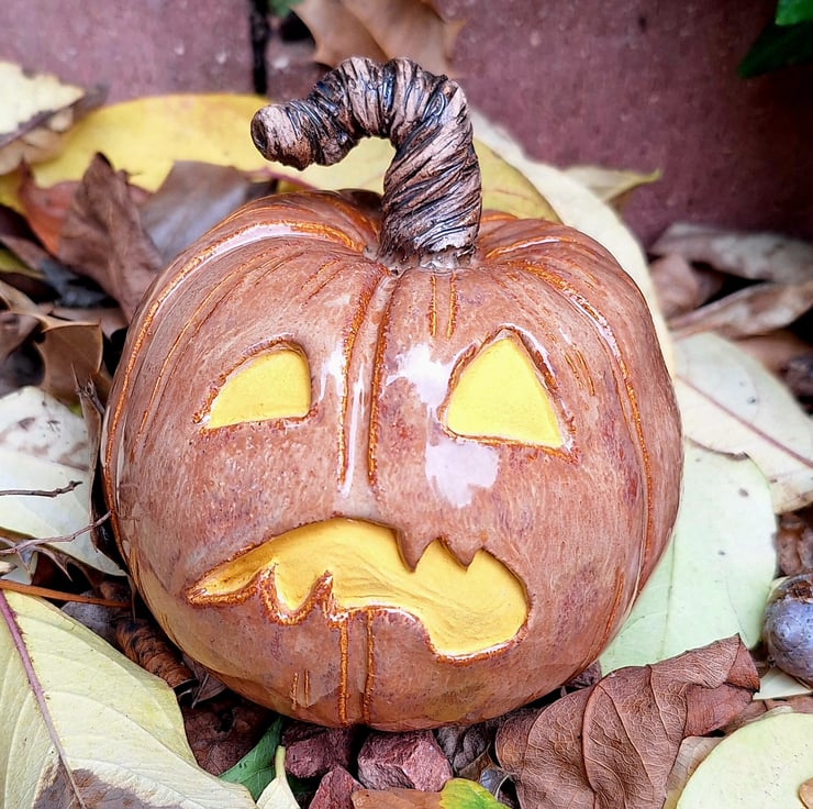 Phyllis is an earthenware ceramic decorative carved pumpkin/Jack 'O' Lantern. She is glazed in a beautiful glossy, mottled pumpkin colour with bright eyes as if lit from inside. She has an authentic looking curly stalk. Phyllis would make the perfect companion for your Celtic Samhain/Halloween celebrations! She is one of a kind.