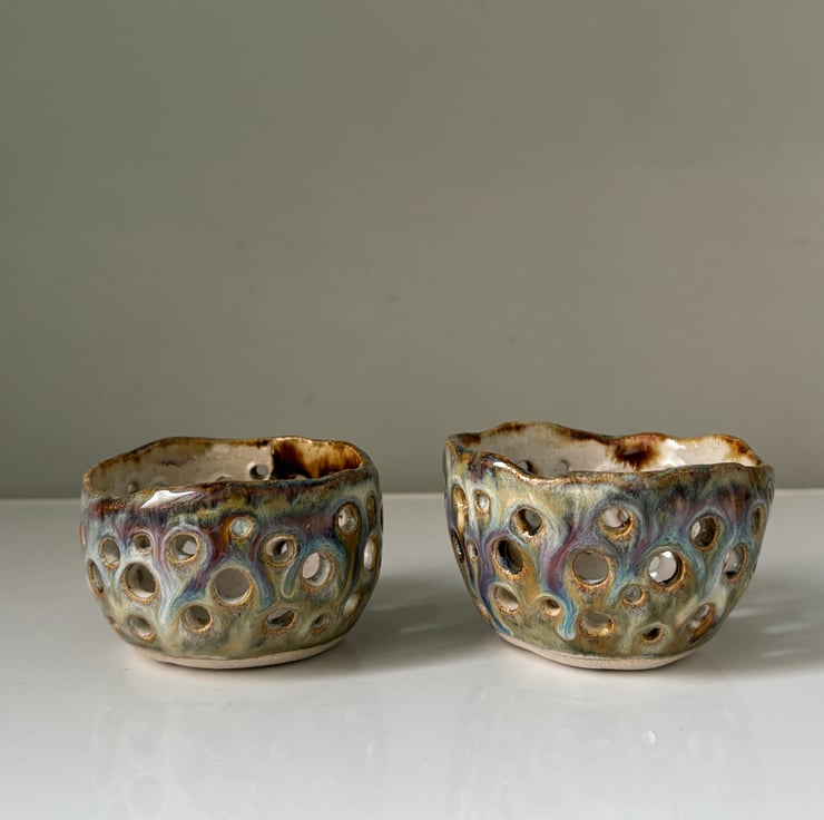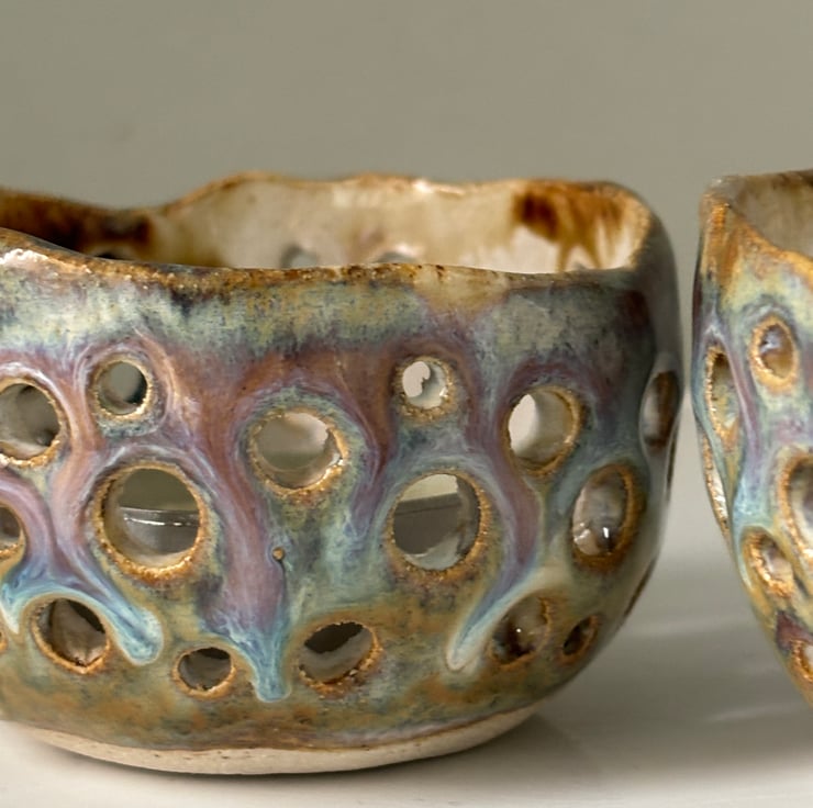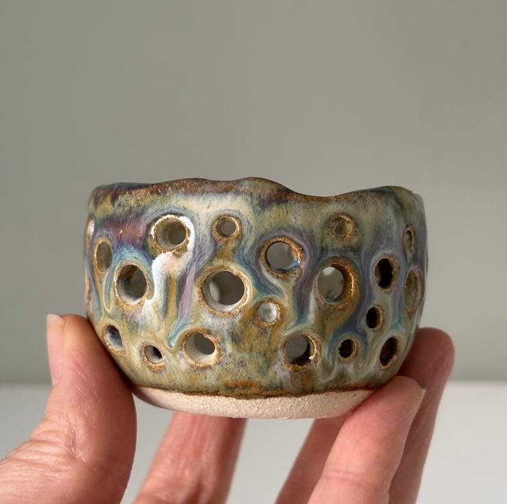 Created by forming a ball of clay through pinching its shape, it is then perforated by hand and fired twice, the second with a mix of flowing glazes to add to its overall effect.