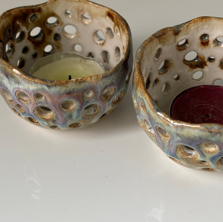 This handbuilt tealight holder is designed to add a warm and enchanting ambiance to your home while showcasing a stunning play of light and shadow.
