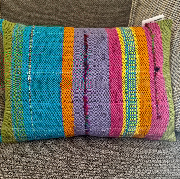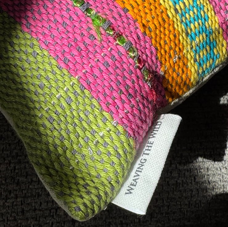 A handwoven front using eco-friendly, sustainably sourced yarns, are used to create these unique SAORI inspired cushions. The cushion is backed using 100% natural linen and the cushion pad is filled with feathers, which is then hand-sewn closed.