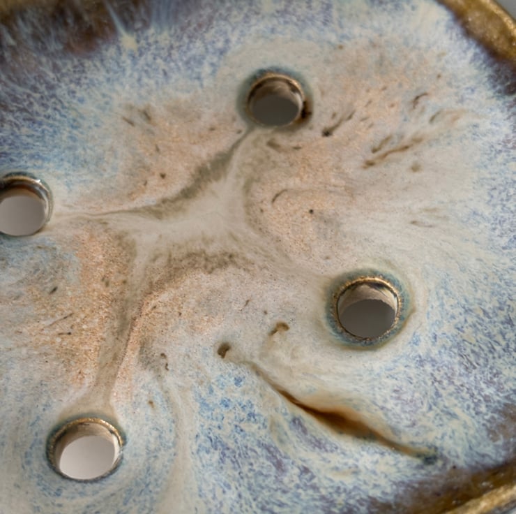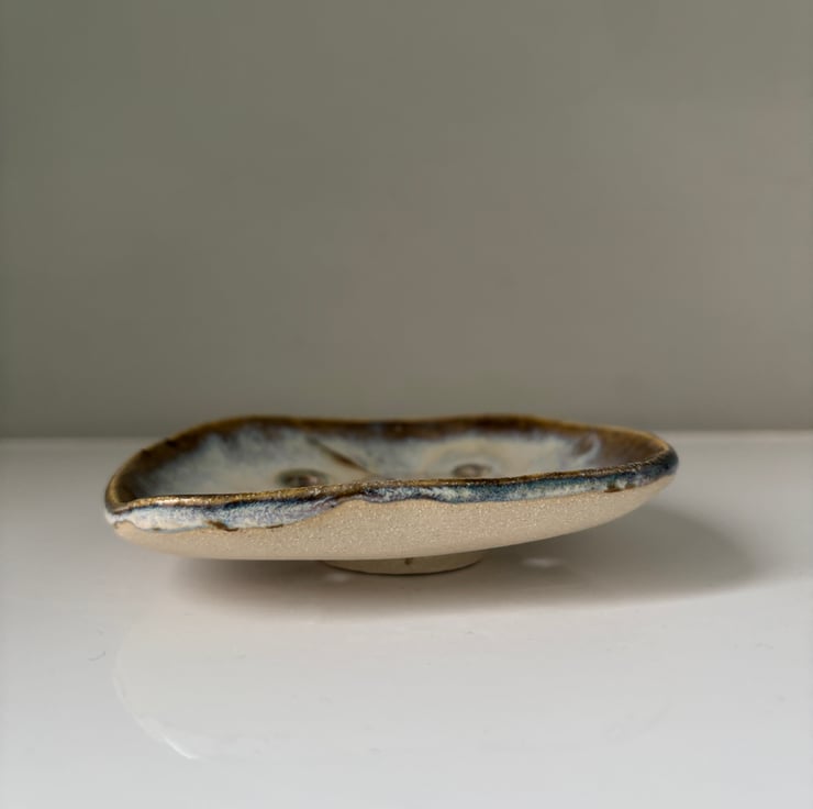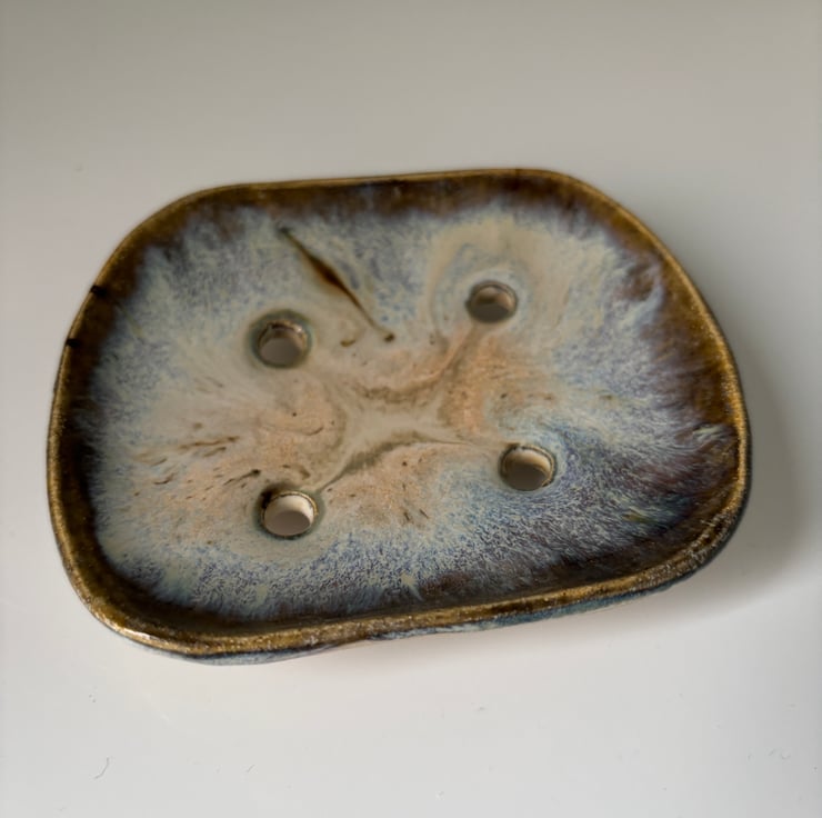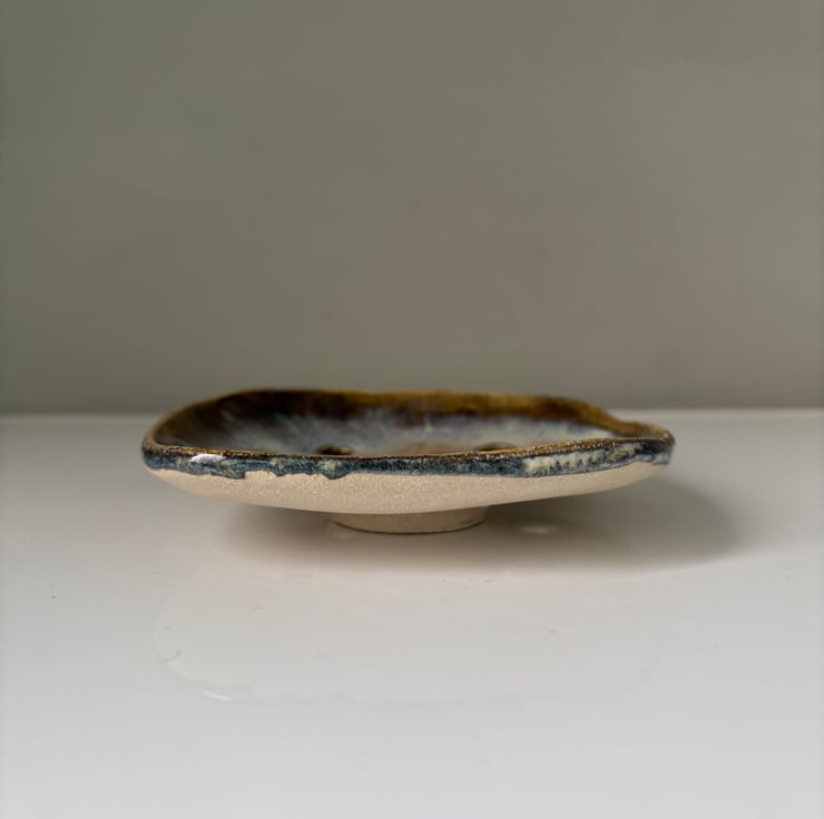 Unique and beautiful handmade ceramic soap dish. This self draining soap dishes has been entirely made by hand by rolling and forming slabs of clay into the finished shape. It has then been left to dry before firing twice. The second firing takes place after layers of different glazes have been brushed on to create the final effect.