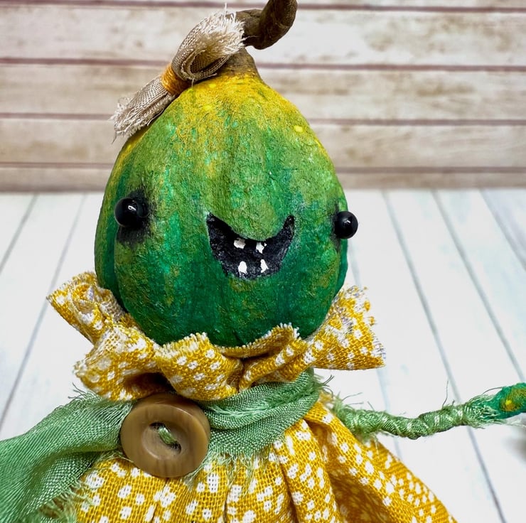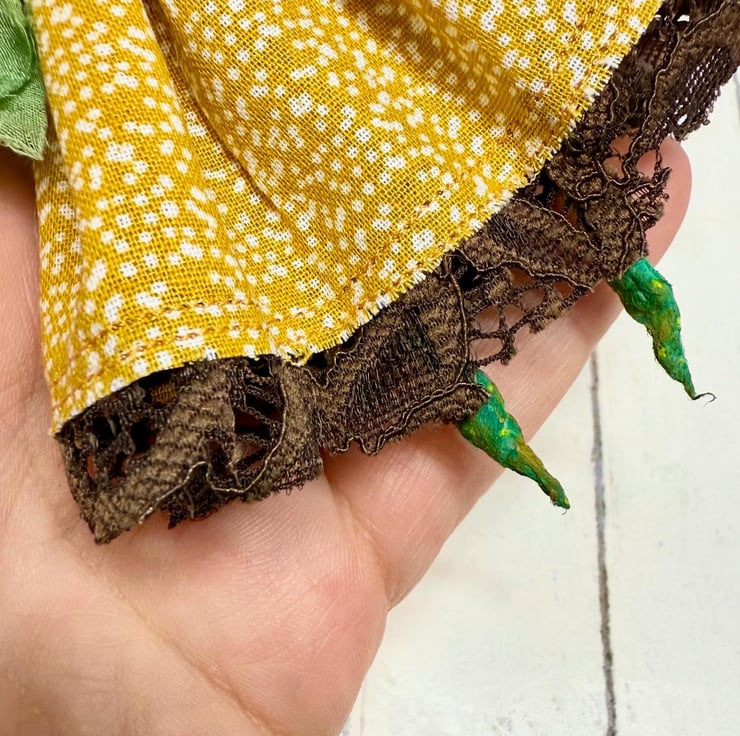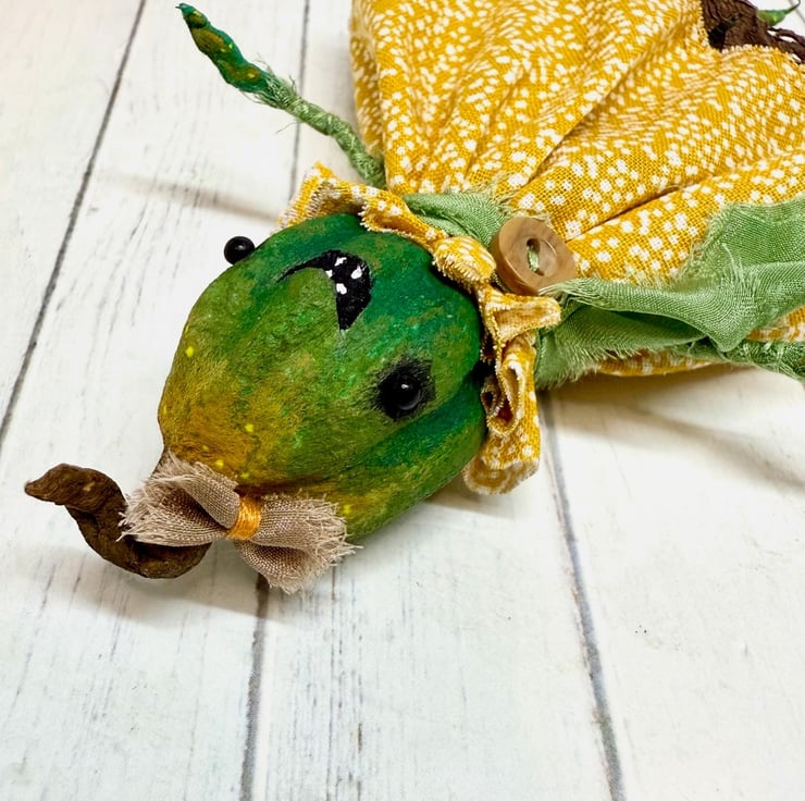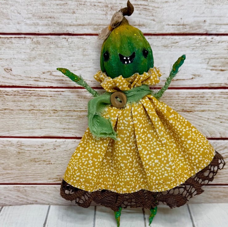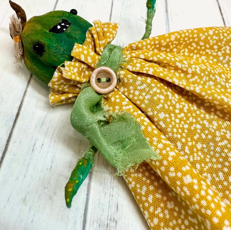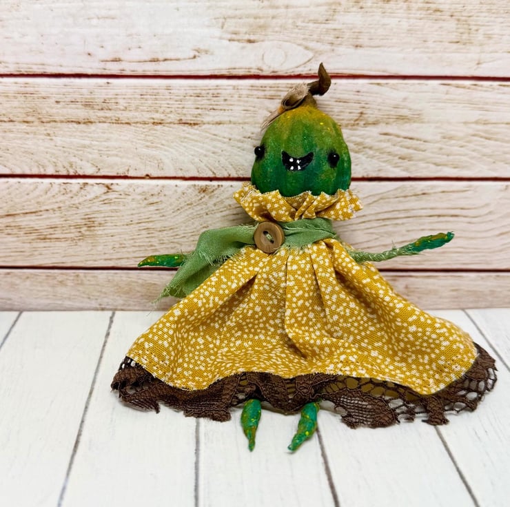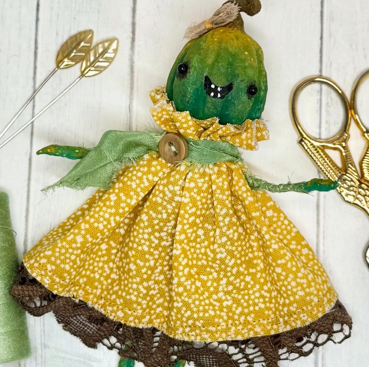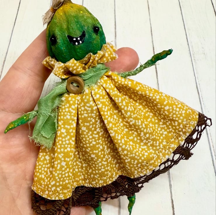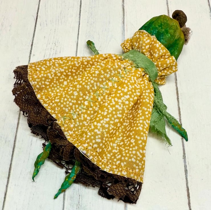 Decorative art doll made from spun cotton with a wire frame making the arms and legs posable. Doll has hand painted head, feet and hands with glass bead eyes. Doll wears hand sewn dress with upcycled lace trim and chiffon scarf and button. Doll has a little bow on their head and measures roughly 14.5cm tall. Sent in recyclable or recycled packaging.