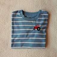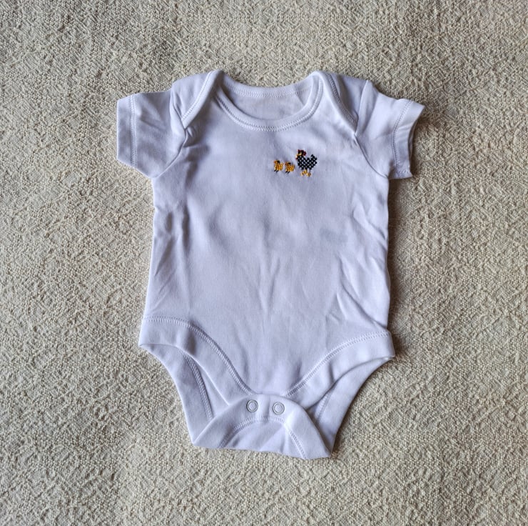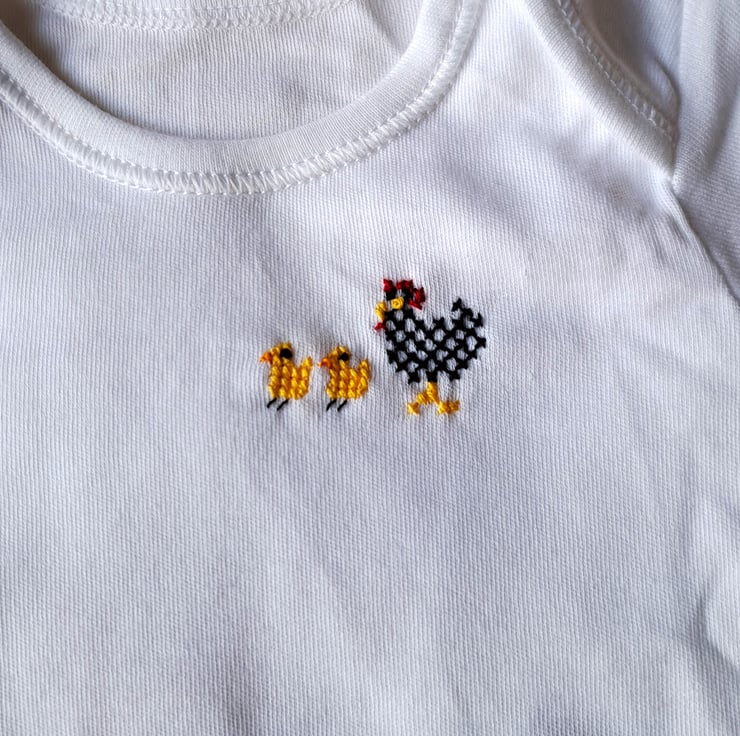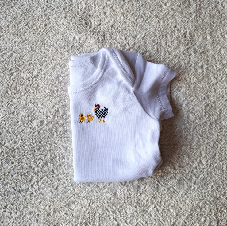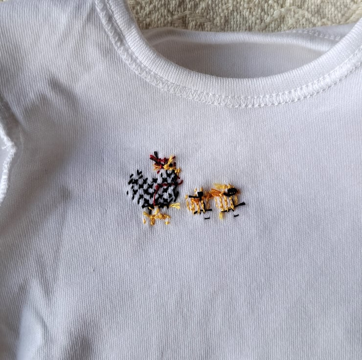 I have hand embroidered a black and white hen with her two yellow chicks on the left front of this soft white baby vest/onesie. As I never use a permanent backing fabric when hand stitching kids' clothing there is nothing inside to irritate your child's skin. The vest has an envelope neck, short sleeves and two press studs between the leg openings. It is all cotton and can be machine washed.