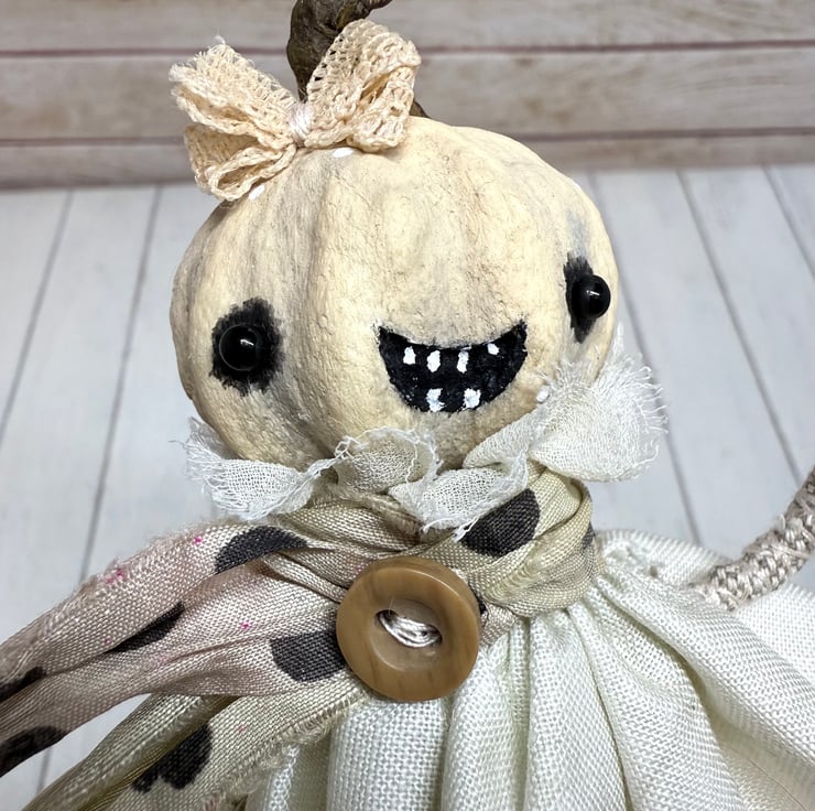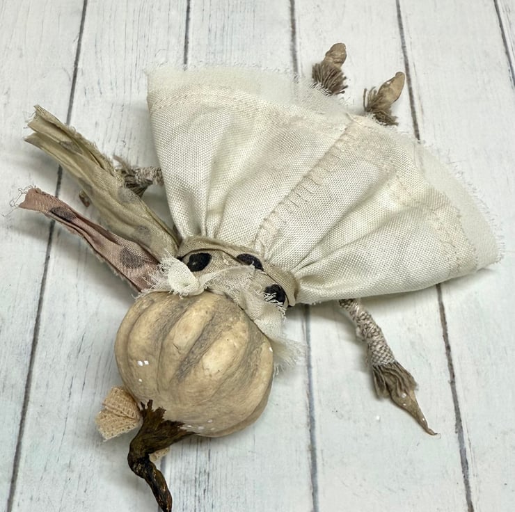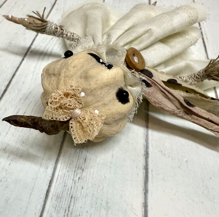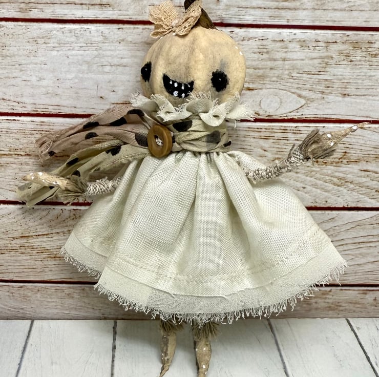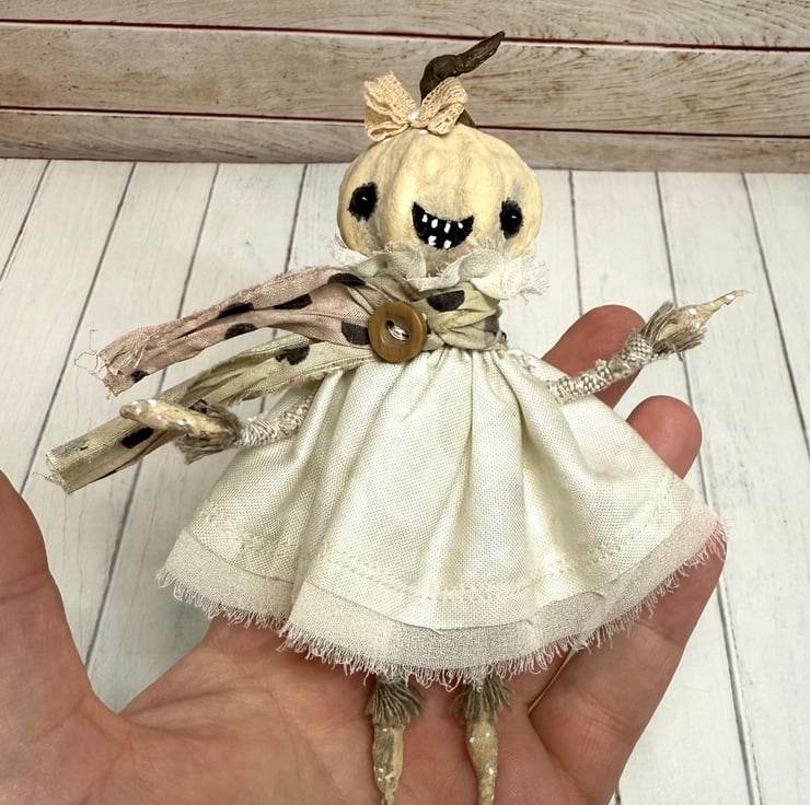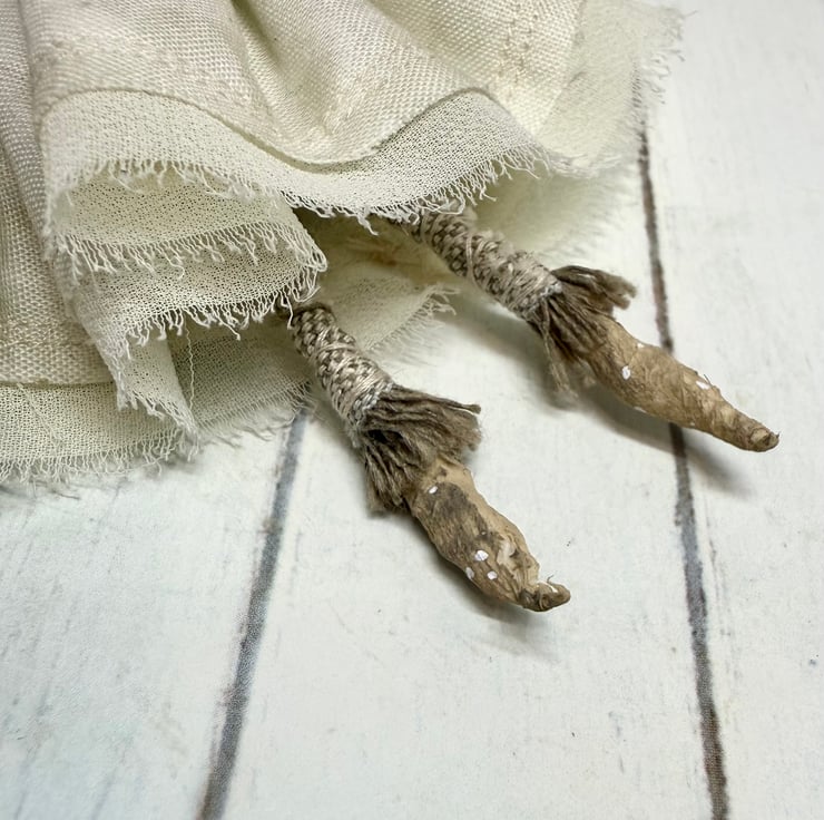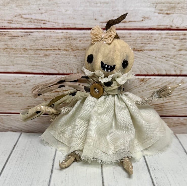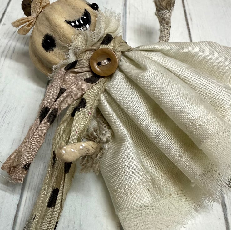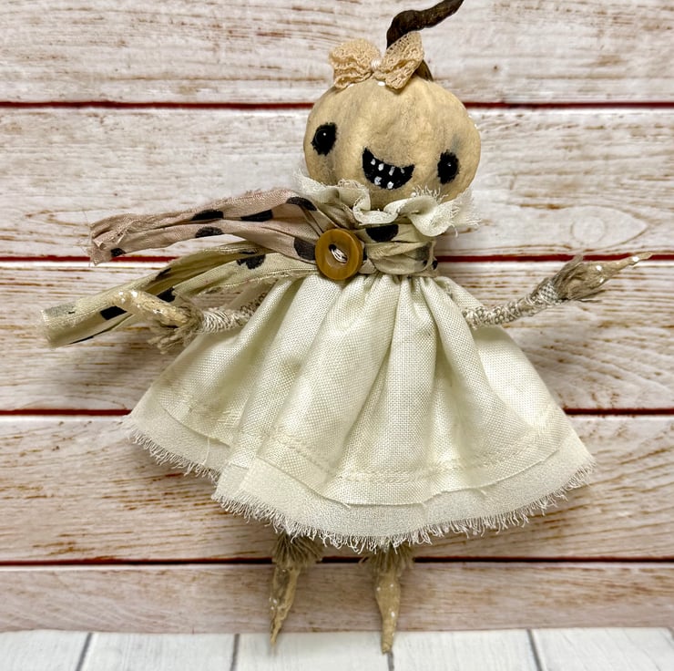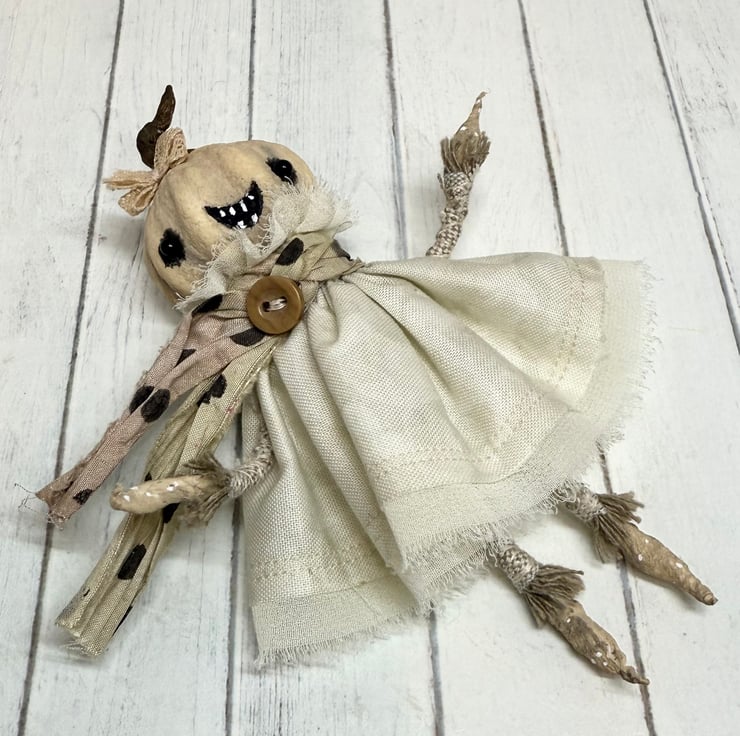 Decorative art doll made from spun cotton with a wire frame making the arms and legs posable. Doll has hand painted head, feet and hands with glass bead eyes. Doll wears hand sewn dress with chiffon trim and sari silk polka dot scarf and button. Doll has a little bow on their head and measures roughly 14cm tall. Sent in recyclable or recycled packaging.