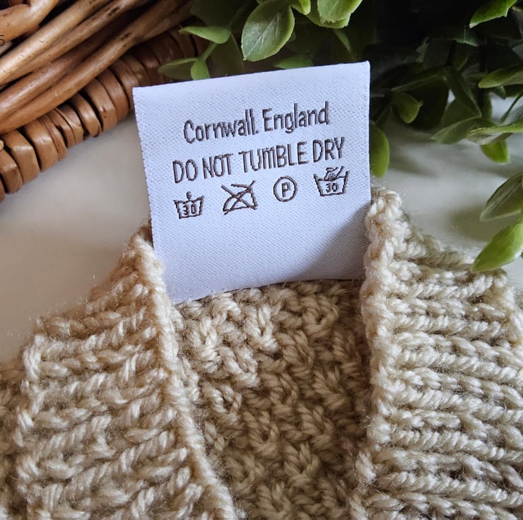 The luxury woven damask Demelza Designs garment label is attached to the back neck edge with the care instructions woven within it on the reverse side for lasting reference. A Demelza garment swing tag will be attached to the cardigan front for a professional touch if gifting.