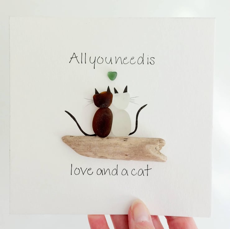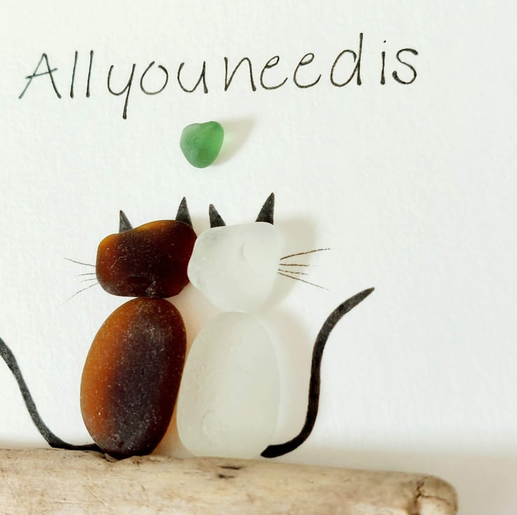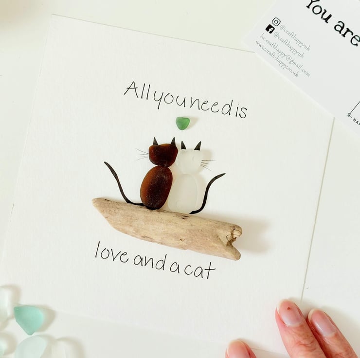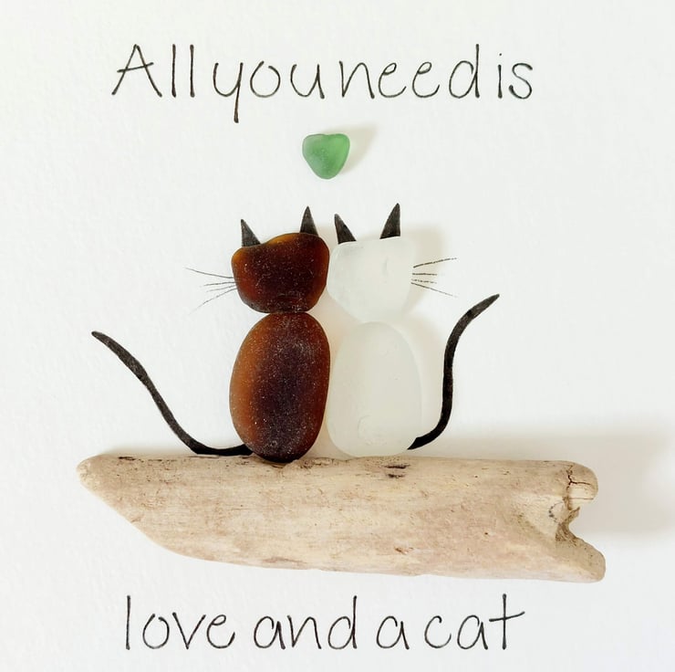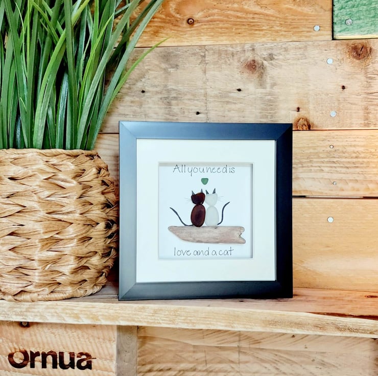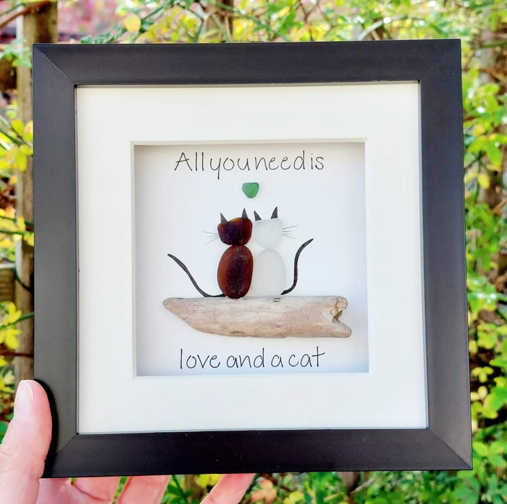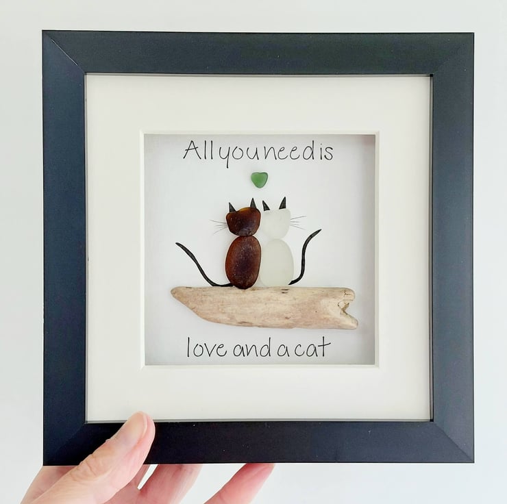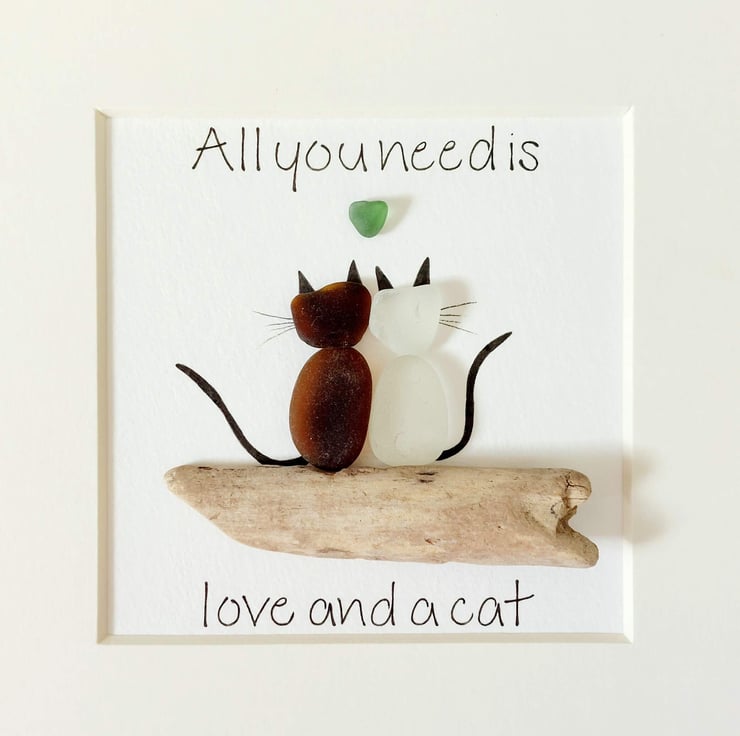 This unique piece of sea glass original framed wall art makes a perfect gift for the cat lover in your life. Available in a black 17.5cm frame with attached stand, and cream mount, this design is crafted using sea glass and driftwood collected on my coastal journeys and features the hand written quote, "All you need is love and a cat" surrounding a pair of cats with a heart above them. It's beautiful and unique and makes a really thoughtful gift.