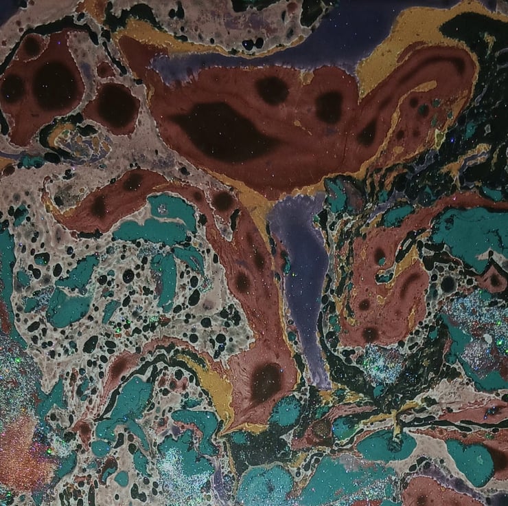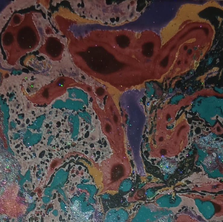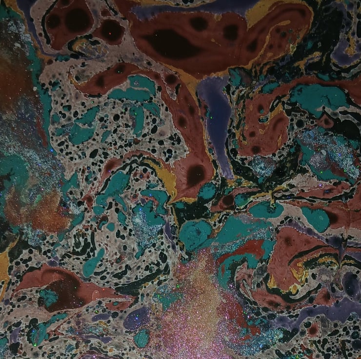 Handmade Marbling Watercolour with fine glitter & iridescent mica powder. A4 painting in wooden frame