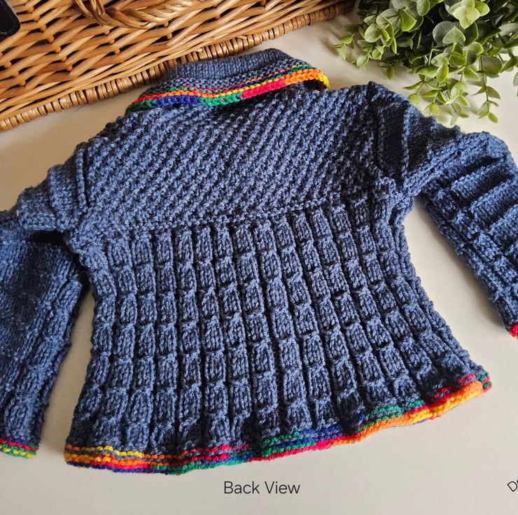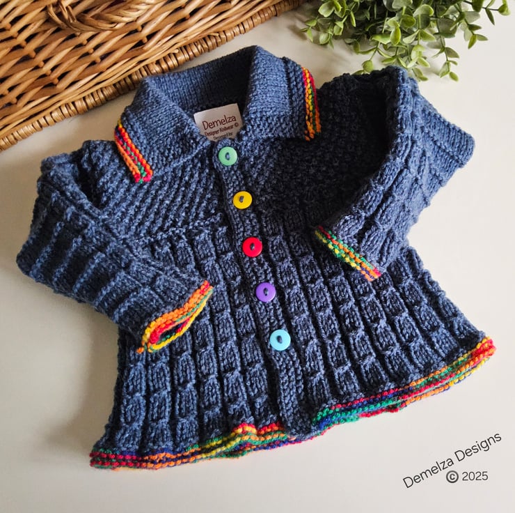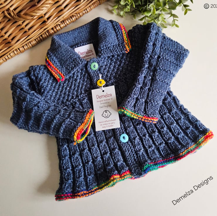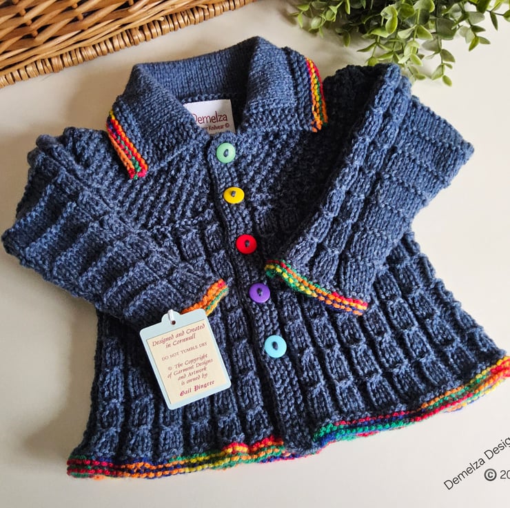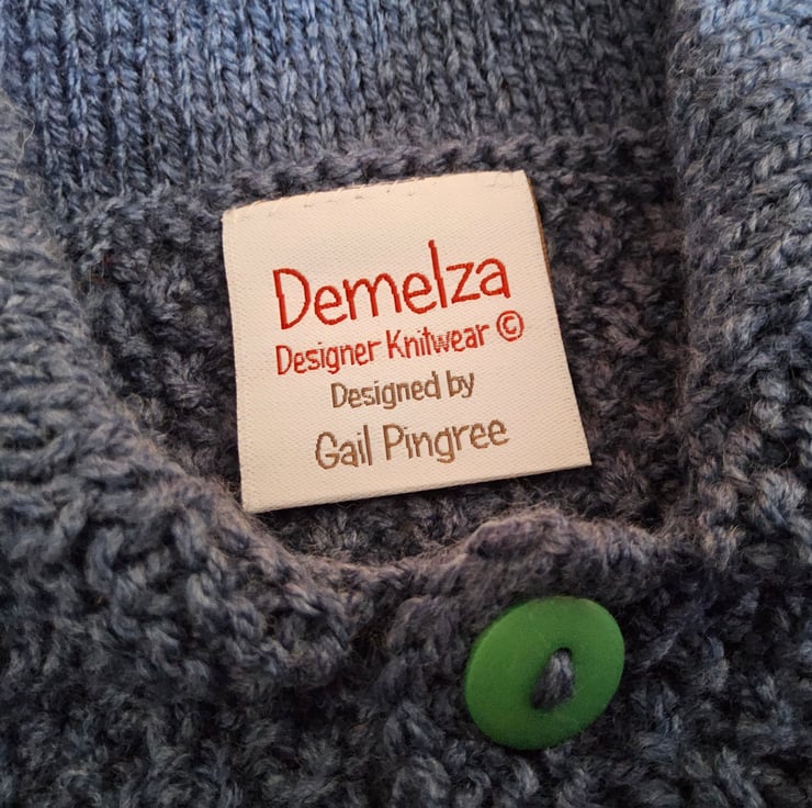 This lovely cardigan has been designed and lovingly hand knitted in Cornwall using branded quality machine washable premium acrylic yarns. The soft luxury damask Demelza Designs garment label is attached to the back neck edge with the care instructions woven within it on the reverse side for lasting reference. A maching Demelza garment swing tag is attached to the cardigan front for a professional touch if gifting.