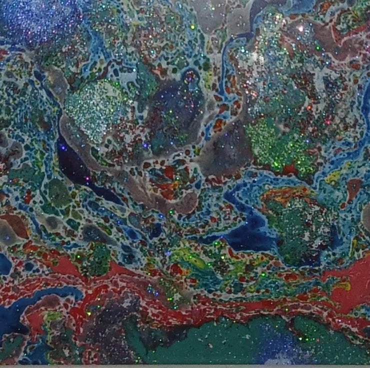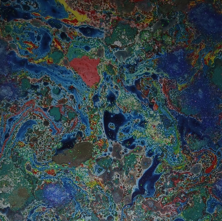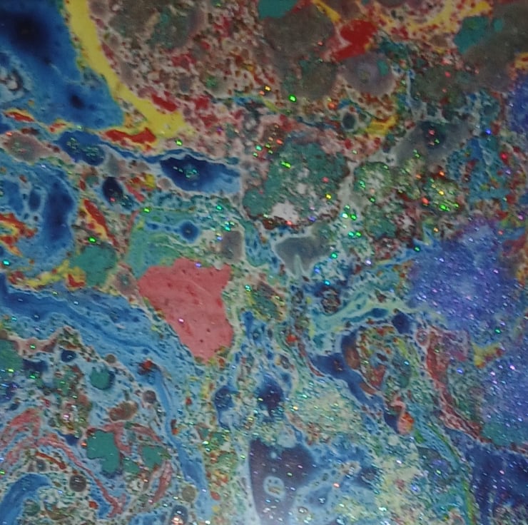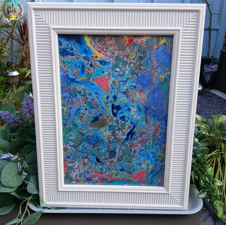 Handmade Marbling Watercolour with fine glitter & iridescent mica powder. A4 painting in wooden frame