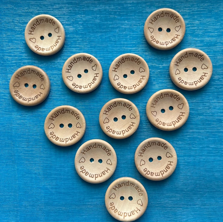 12 wooden buttons, each 25mm in diameter, with handmade printed on them.