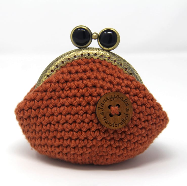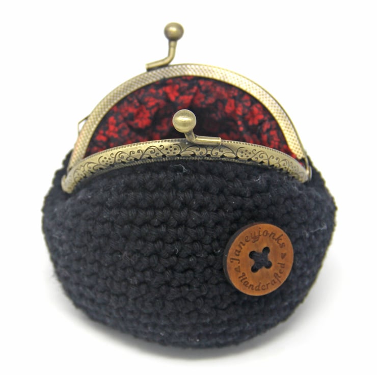 A delightful little crocheted purse. Vintage Retro styling crocheted from 100% cotton and fully lined in a pretty complementary floral fabric. The metal clasp is an antique bronze colour.