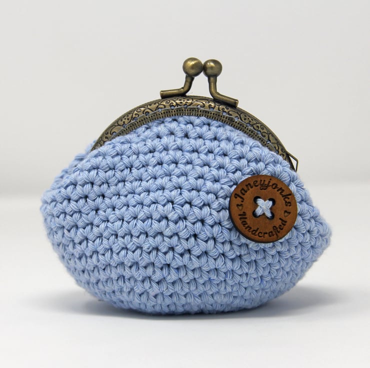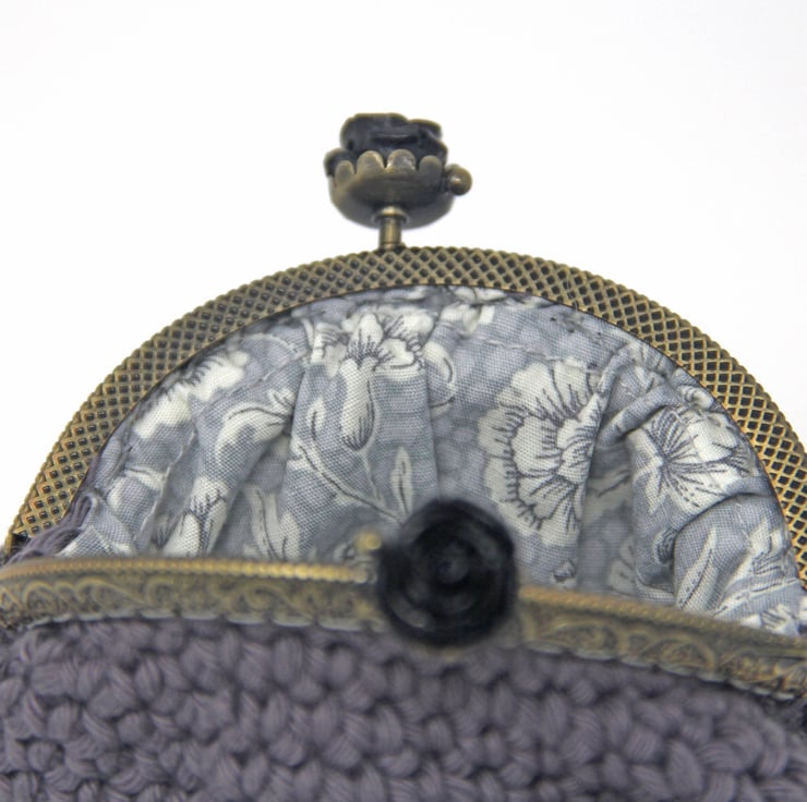 A fully lined hand crocheted purse. Fantastically retro styling crocheted from 100% cotton and fully lined in a pretty complementary floral fabric. The metal clasp is an antique bronze colour. This little purse is perfect for cons or earbuds or so many other little things.