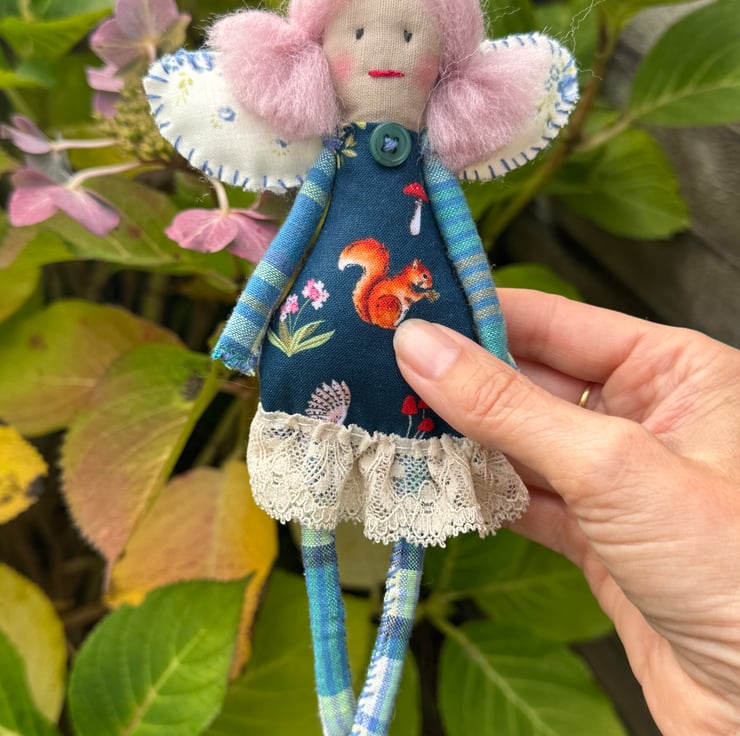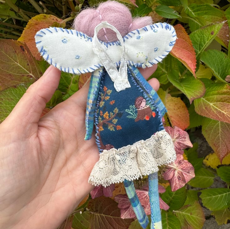 The body has been stitched using my vintage Singer sewing machine, the clothes and wings are slow stitched using deliberate, gentle hand stitching