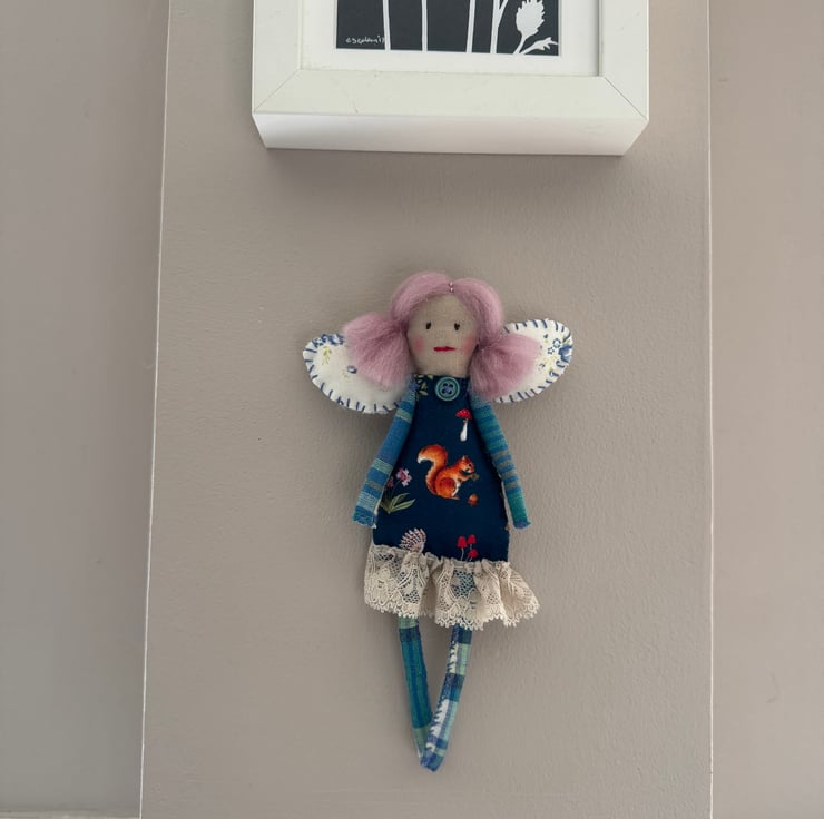 She is made from a variety of fabrics both vintage and modern, and she has handmade wings. I have created her hair from merino yarn in a lovely lavender shade