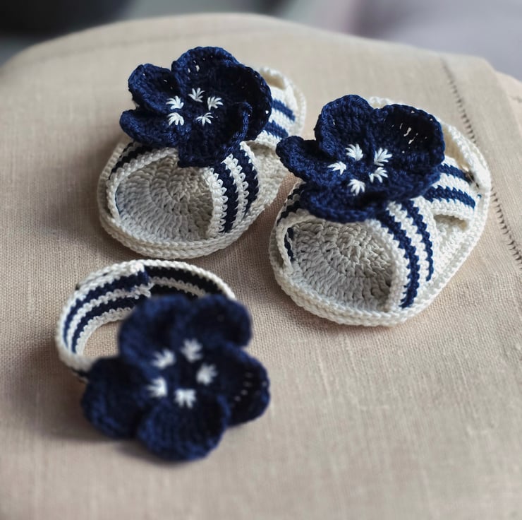 Each pair is lovingly crocheted using soft cotton yarn, shaped into gentle petals that rest comfortably against tiny feet and caring wrists. The navy set adds a touch of timeless charm.