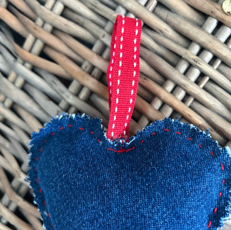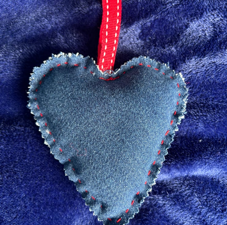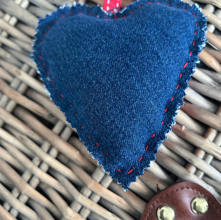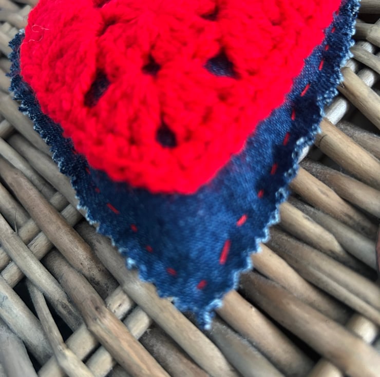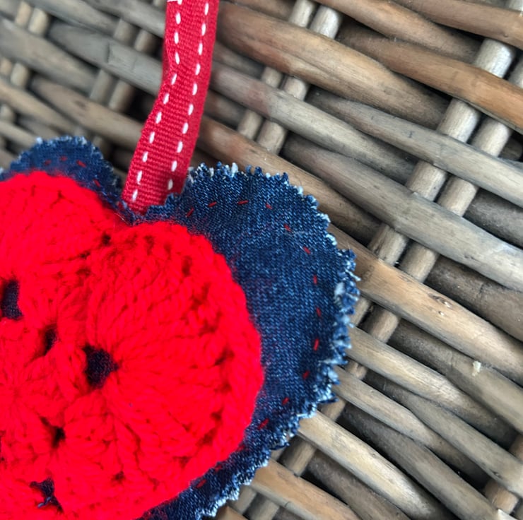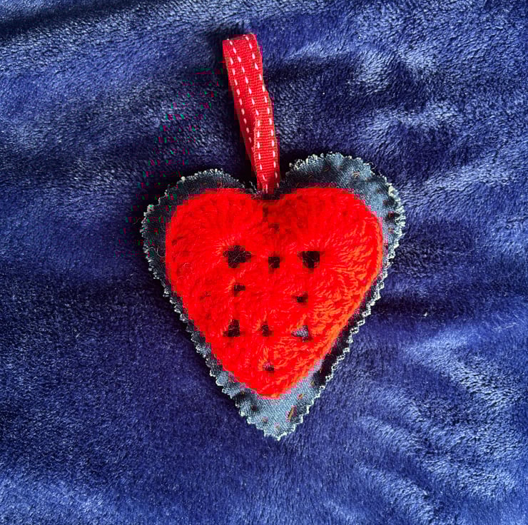 Shabby chic hanging heart, hand stitched, comprising of recycled denim with a red ribbon loop to the top and a crocheted heart stitched on the front. Stuffed with 100% acrylic stuffing