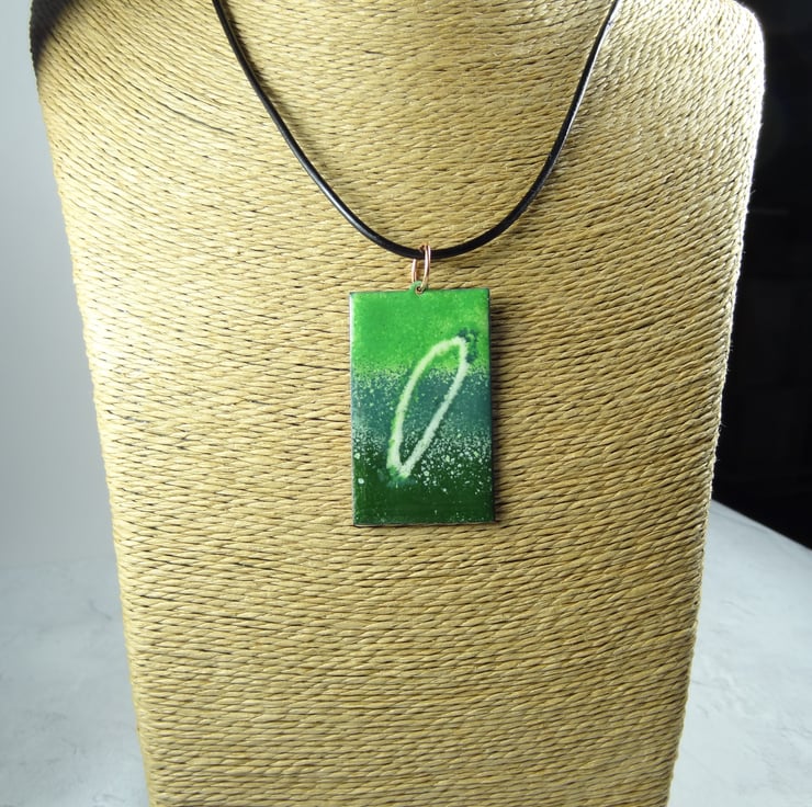 Green glass enamelled copper rectangular pendant, leather cord, 47x29mm (0117)