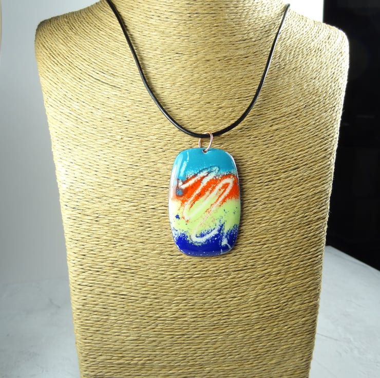 Blue orange yellow glass enamelled copper pendant, leather cord, 51x34mm (0078)