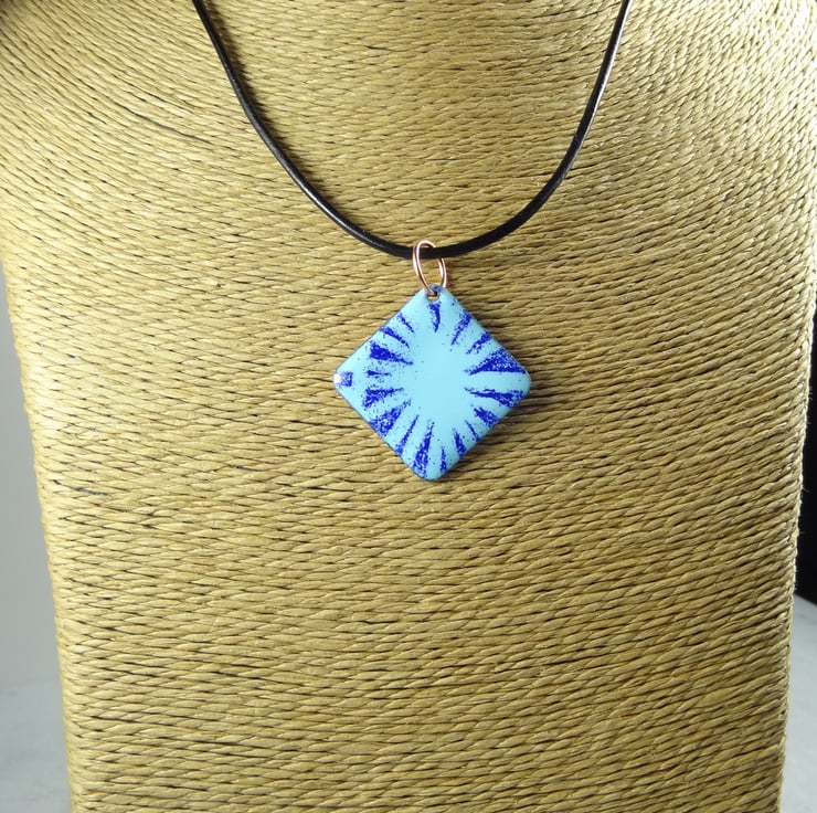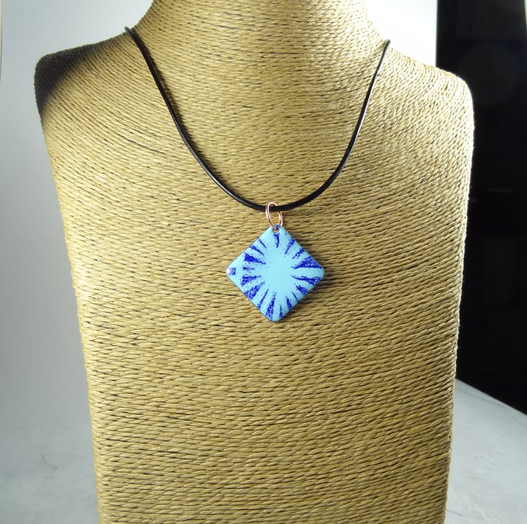 Glass enamelled copper pendant on a black leather cord with lobster clasp, handcrafted by myself in Wiltshire.