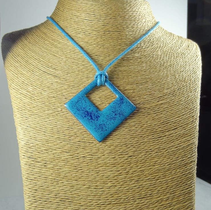 Blue speckled glass enamelled copper rhombus pendant cotton cord 39x17mm (0074)