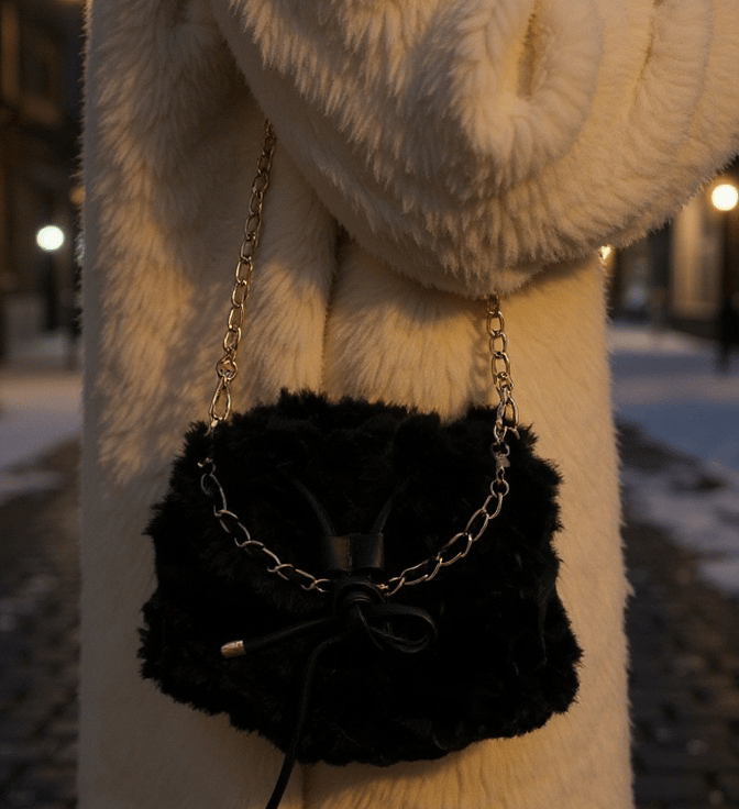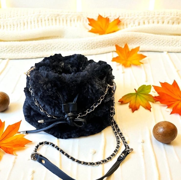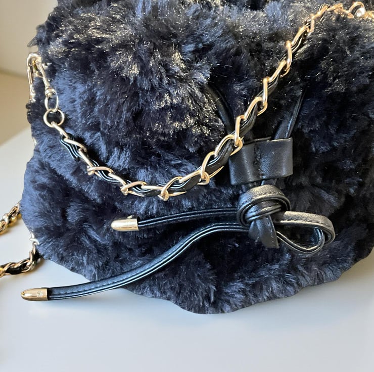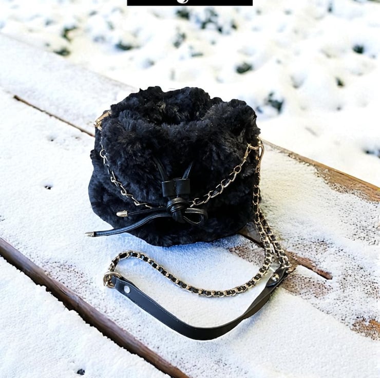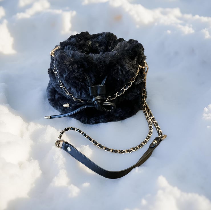 Hand Crochet in Black Yarn and Black Fur Yarn, crossbody chain strap and vegan leather leather drawstring and short chain strap
