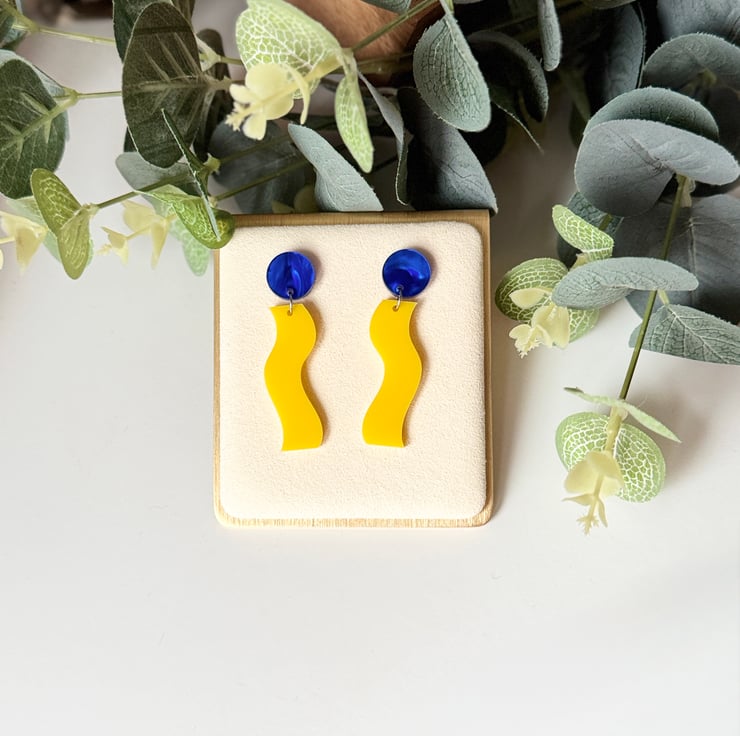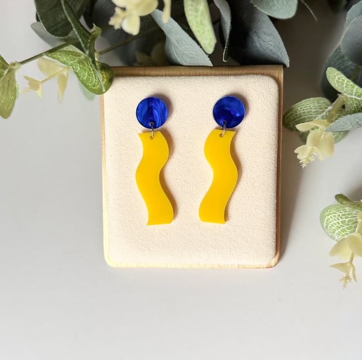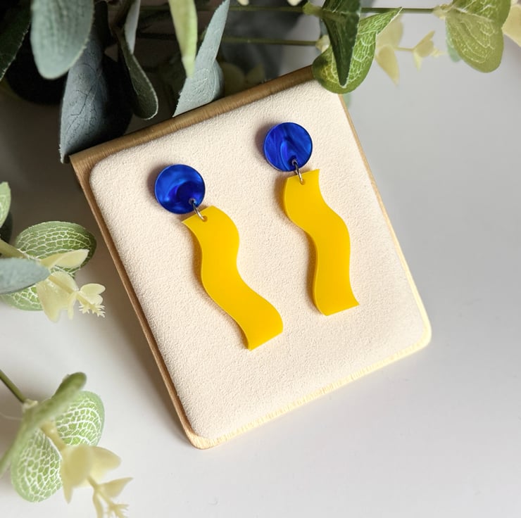 Attached to a Bold Contrasting and Colour Complementary Yellow Elongated Rectangular Wave Shape.