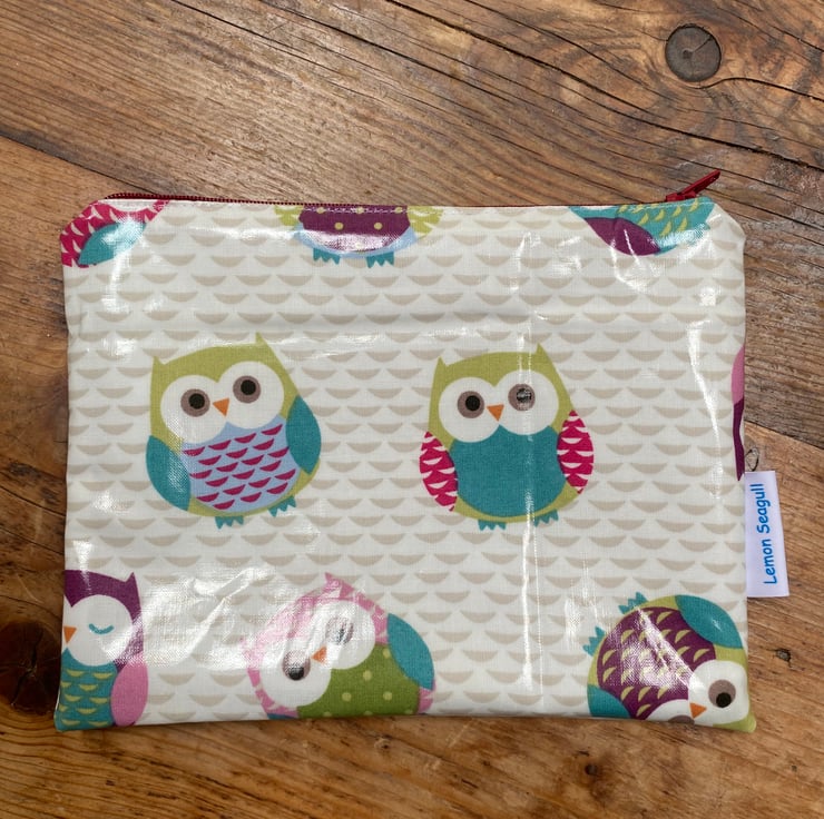 This make up bag is made from a white oil cloth with coloured owls. The bag is lined with a white cotton fabric and a burgundy zip.
