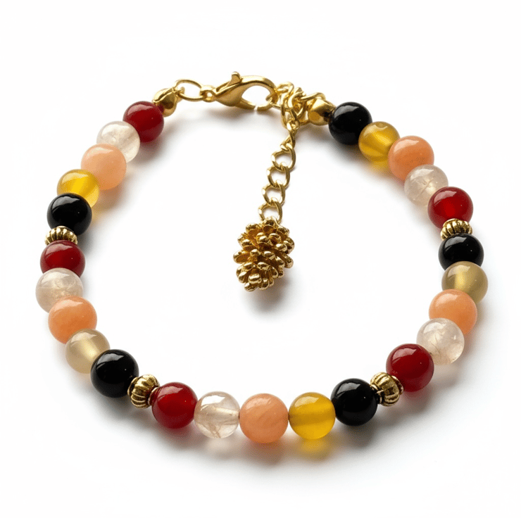 Embrace the vibrant hues of Autumn with our stunning multi-colored bead bracelet, featuring 6mm gemstones like Citrine, Coffee Agate, Sunstone Jade, Champagne Dyed Jade, and Red Stripe Agate, Adorned with elegant golden Tibetan pumpkin-style spacer beads, this bracelet measures approximately 7” and includes a lobster clasp with an extender chain for a perfect fit. The charming pine cone charm adds a whimsical touch, making it a delightful accessory for any occasion. It comes beautifully wrapped in tissue and an organza gift bag, ready for gifting or treating yourself.