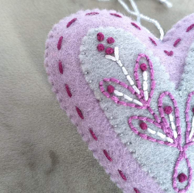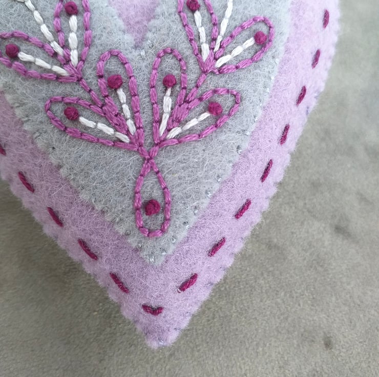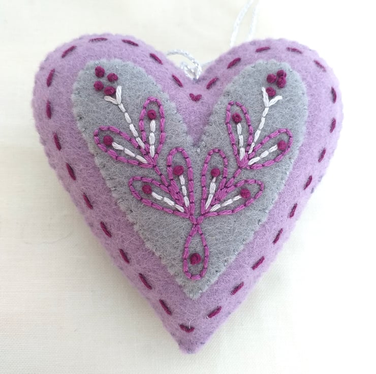 A pretty Lilac wool felt heart ornament with a grey heart inset and pink and purple embroidery.