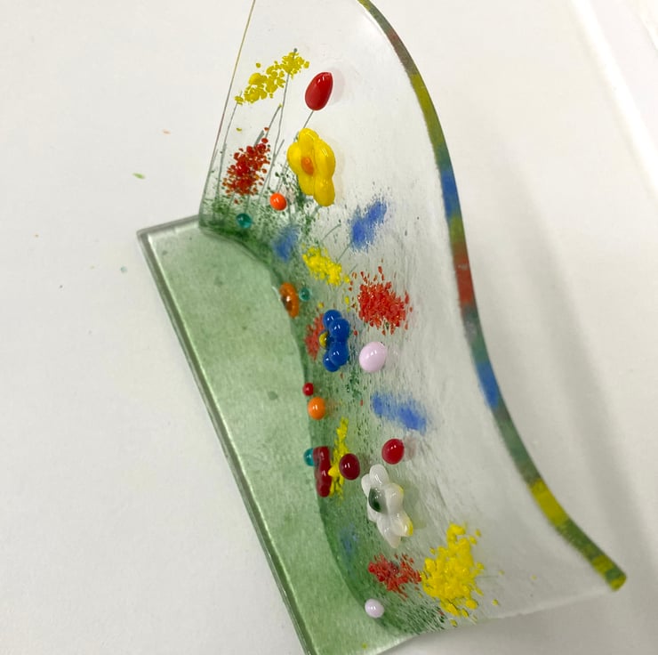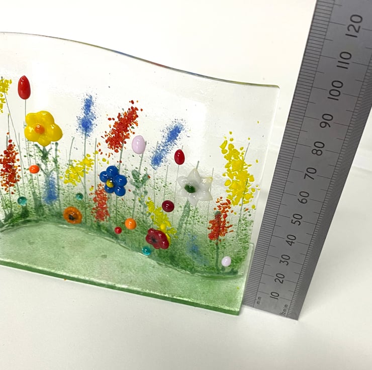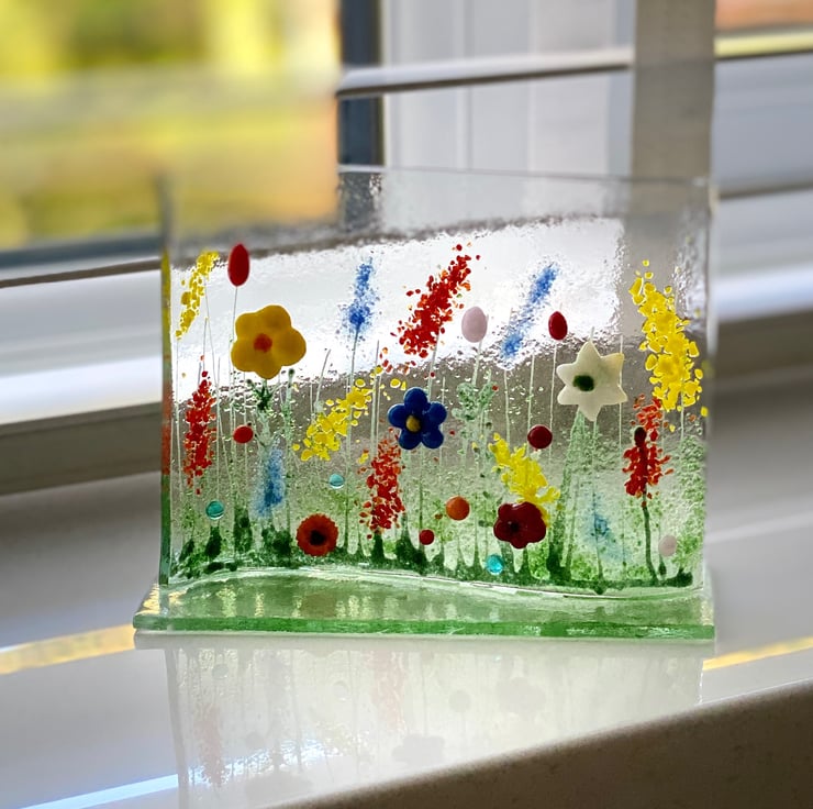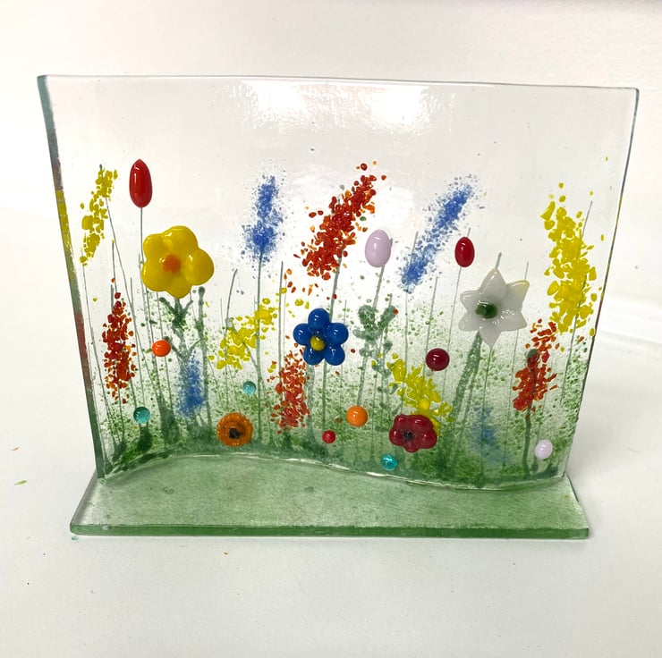 Gorgeous fused glass meadow stand up ornament . Tha floral wave shape stands on a glass base and is designed to sit on a window sill or shelf. Mimicking a colourful summer meadow . See dimensions on photographs .