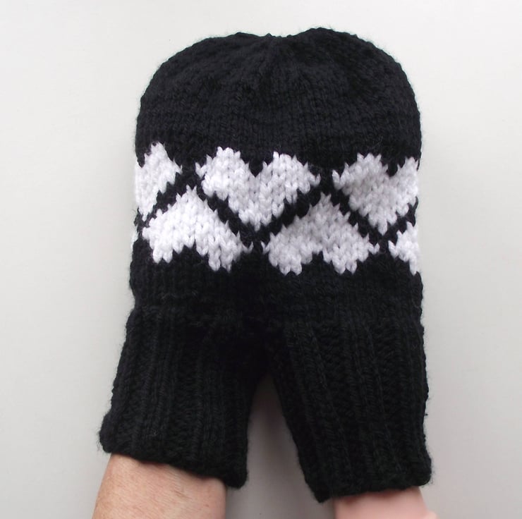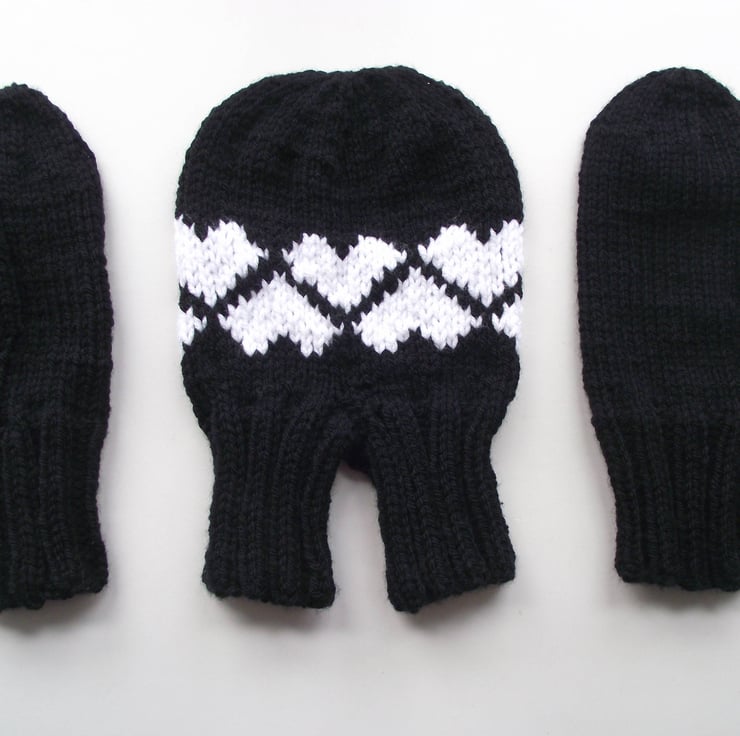 This is such a cute gift idea for your partner or for a couple! The double mitten enables a couple to hold hands while wearing the same mitten while going on those winter walks. There are also matching mittens, large for him and medium for her. This set is knitted in premium black acrylic, with white hearts on the double mitten.