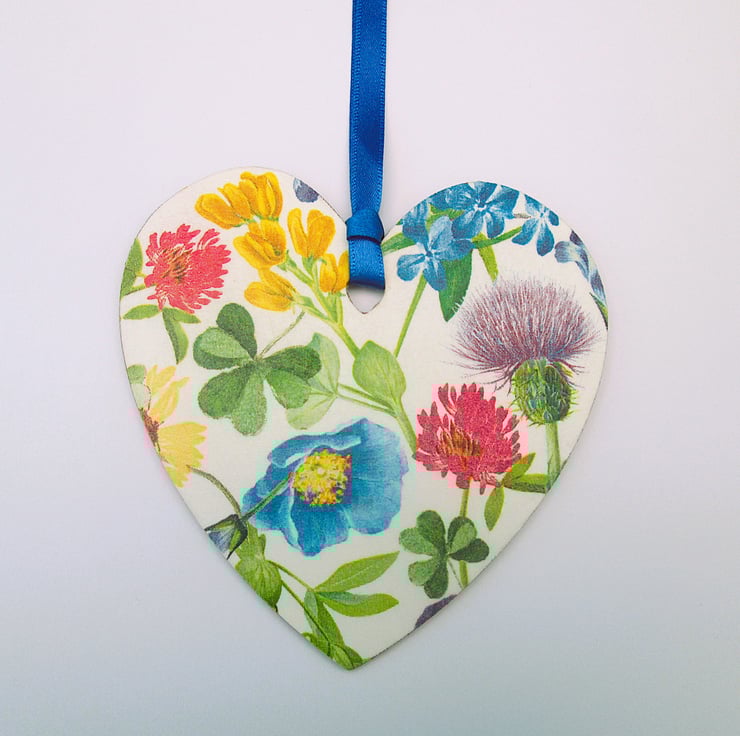 A lovely 10cm decoupage heart flat wood floral ornament is just perfect to add to your indoor decor for any season. It has matching ribbon for hanging, so it's ready to display or to gift. The reverse of the ornament is the natural wood. There maybe an odd crinkle on your ornament, but that is completely normal for anything made with decoupage.