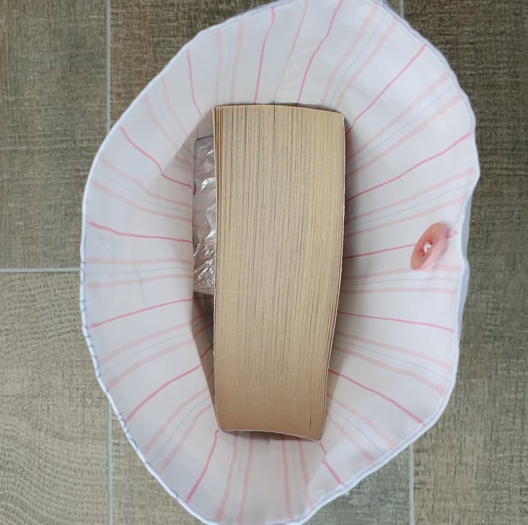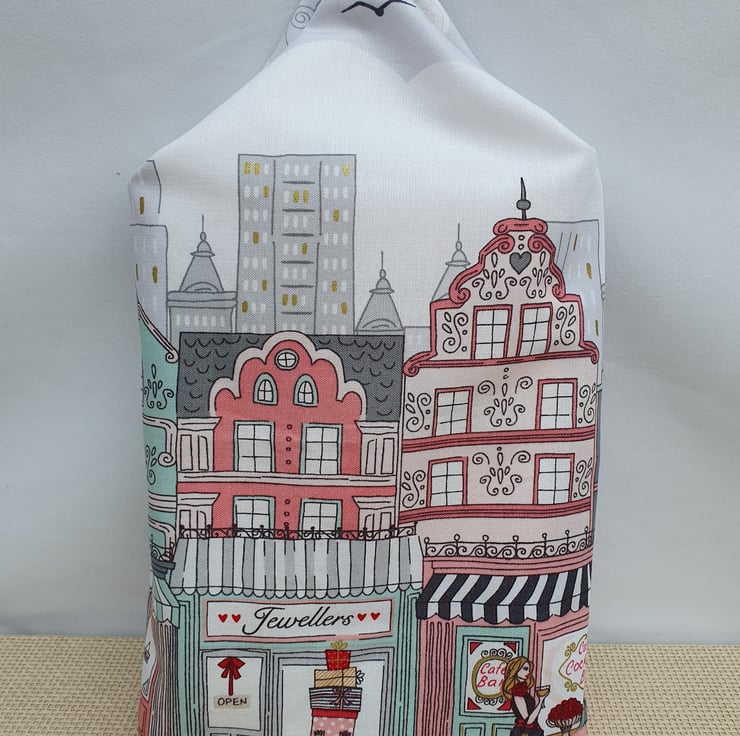 This reusable, fabric gift bag is lined for extra strength and has a simple fold and button closing.
