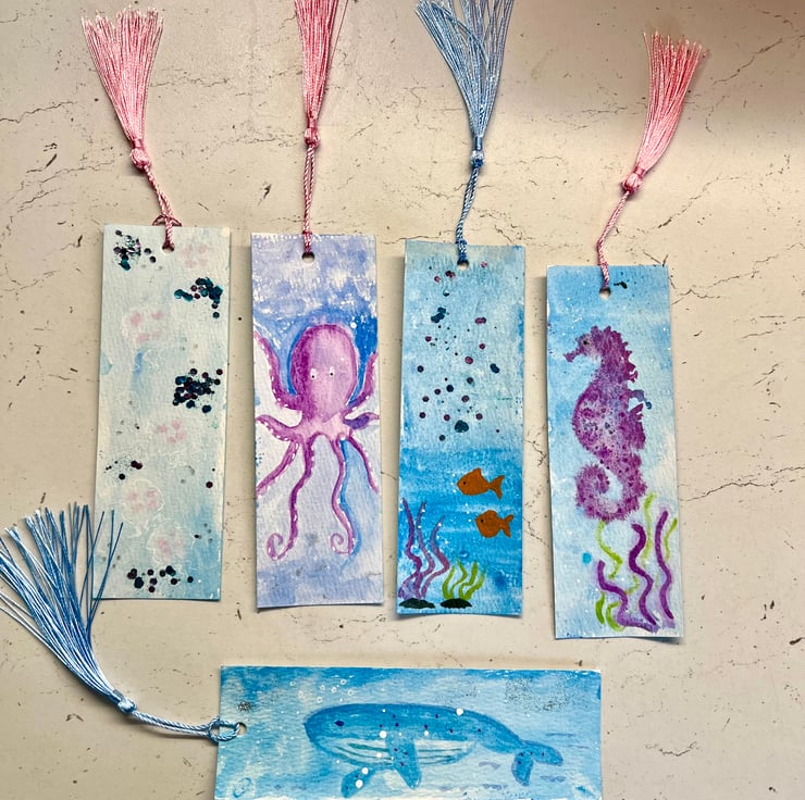 5 Designs painted on 300gsm watercolour paper. Delicate, quirky and unique book marks for us thalassophiles who also love books!