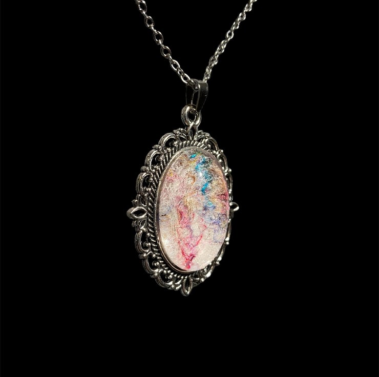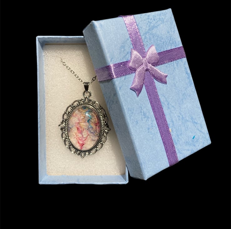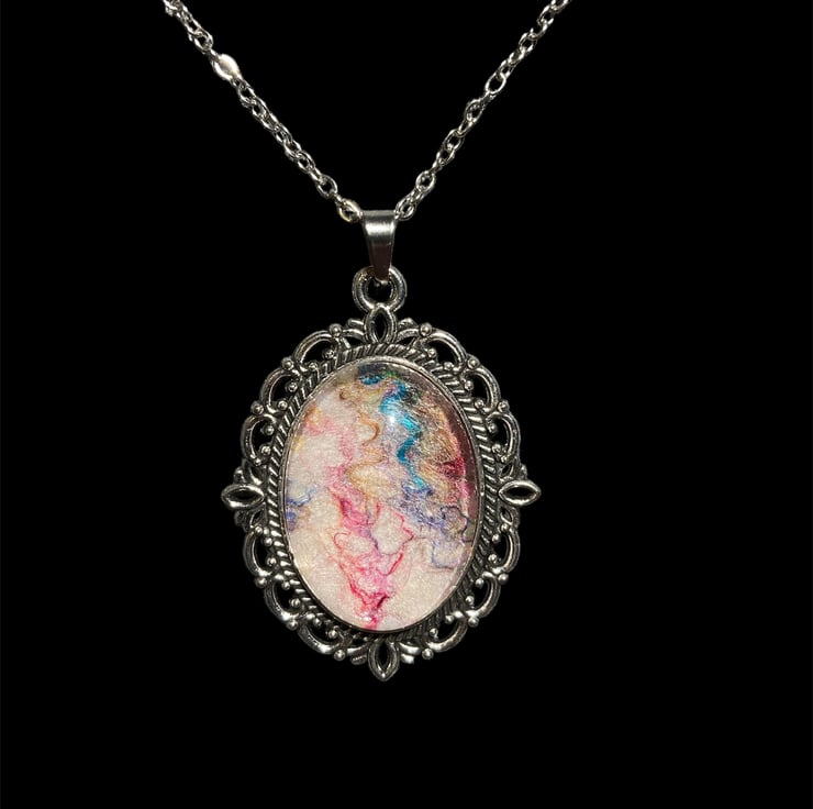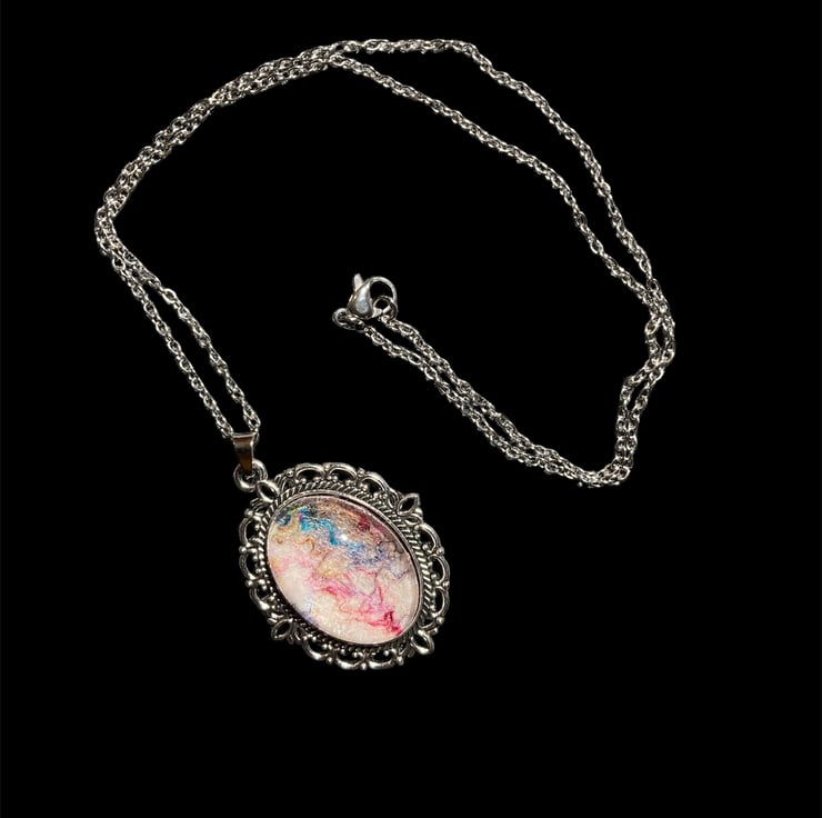 A gorgeous handmade felted wool and silk fibre art pendant necklace made using white woollen fibres overlaid with multicoloured silk fibres. The felt has been set beneath a glass cabochon in an ornate vintage style silver tone frame bringing a pop of colour to any outfit. The glass cabochon enhances the texture and colour of the wool and silk felt below.
