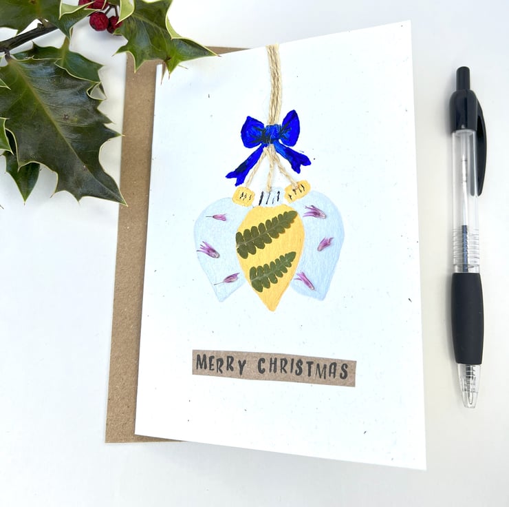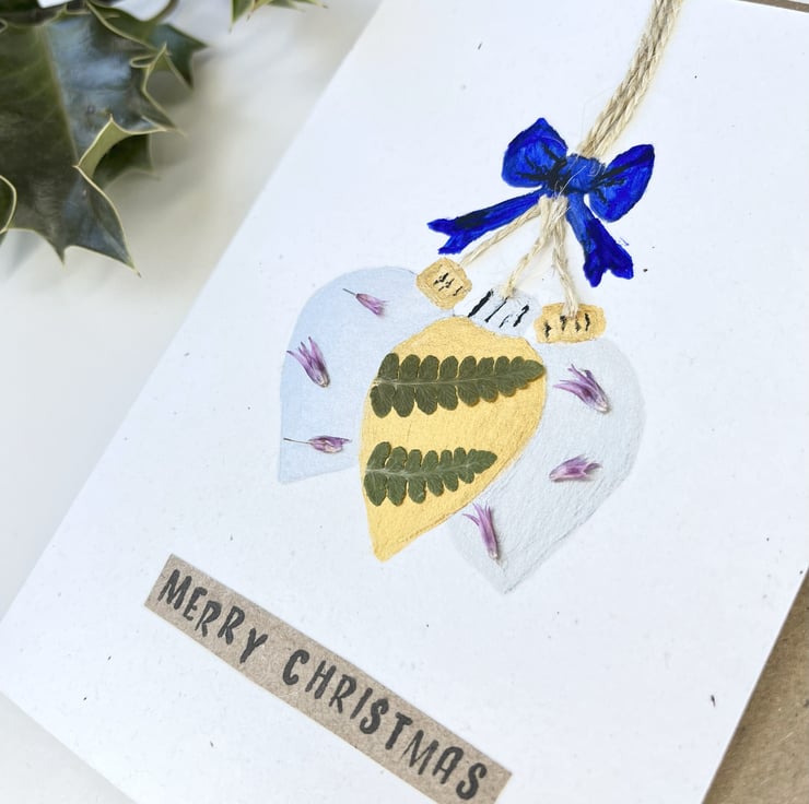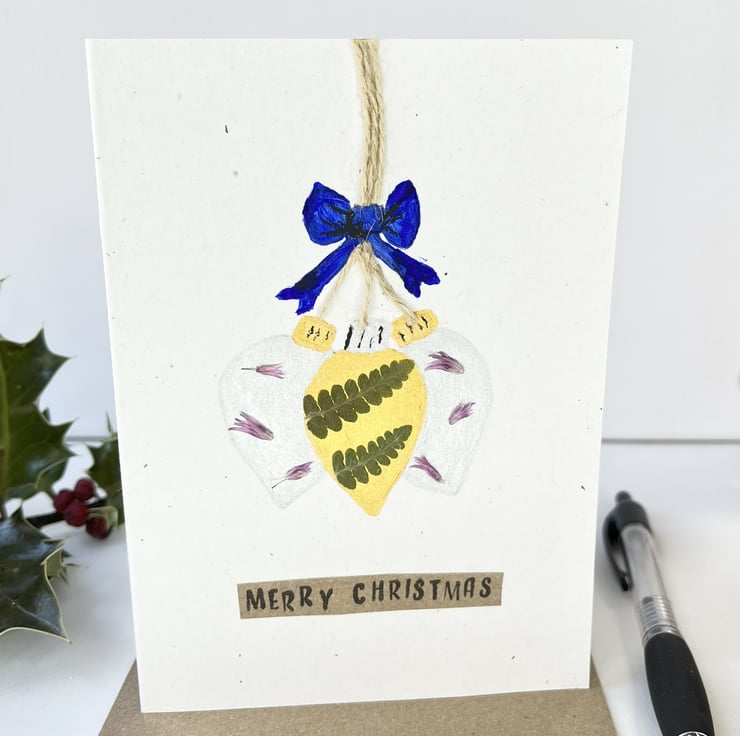 This lovingly handmade festive Christmas card is hand painted and includes traditionally slow pressed Chive flowers and ferns from our garden.