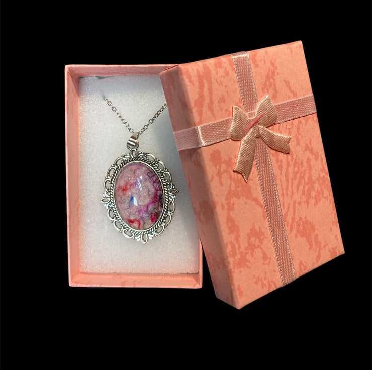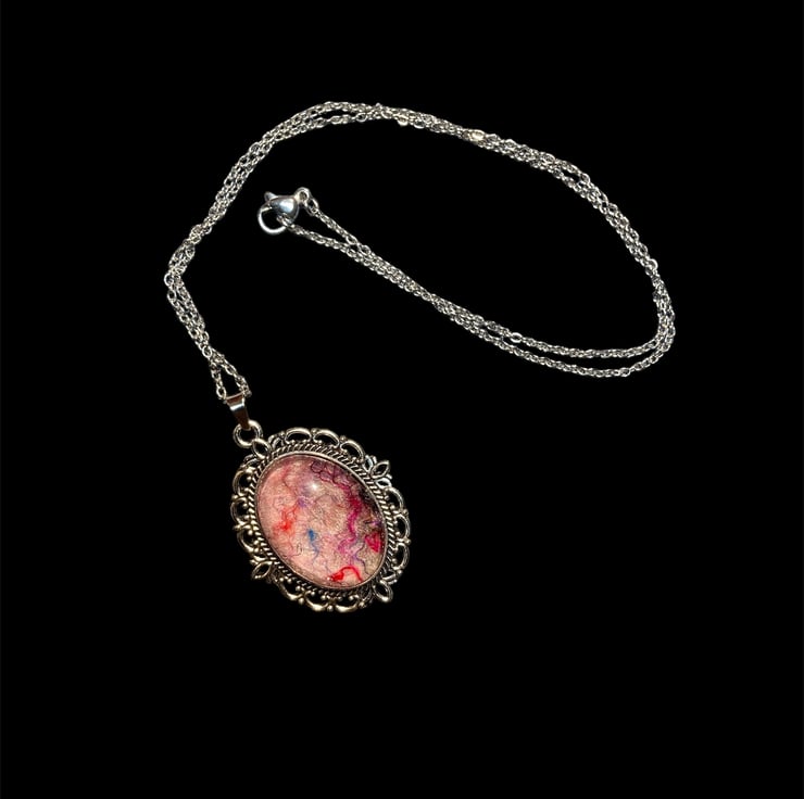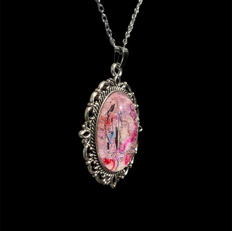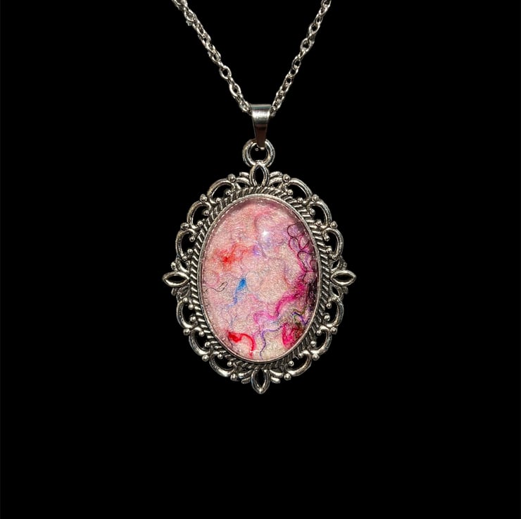 A gorgeous handmade felted wool and silk fibre art pendant necklace made using pale pink woollen fibres overlaid with multicoloured silk fibres. The felt has been set beneath a glass cabochon in an ornate vintage style silver tone frame bringing a pop of colour to any outfit. The glass cabochon enhances the texture and colour of the wool and silk felt below.