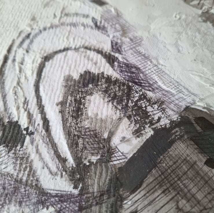 Through a limited palette of black, white, green, grey and indigo, I aimed to create a calm yet tactile composition — a meeting point between nature, texture and form.