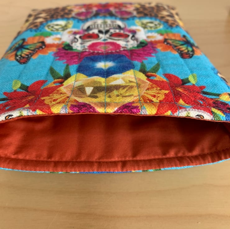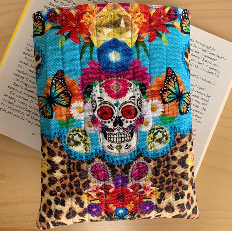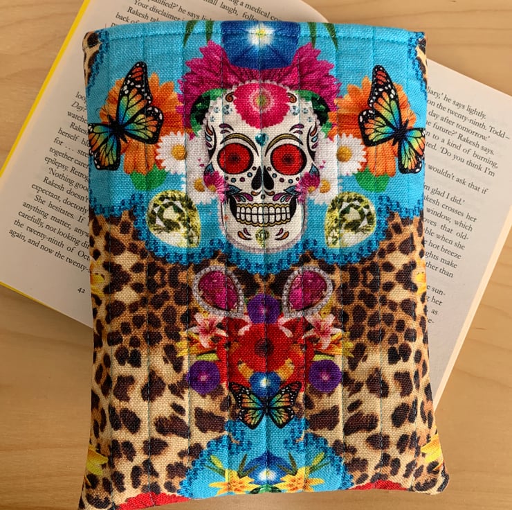 It is made in this stunning day of the dead skulls fabric, with butterflies, jewels and leopard print on a blue background.