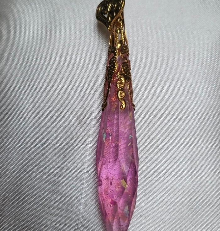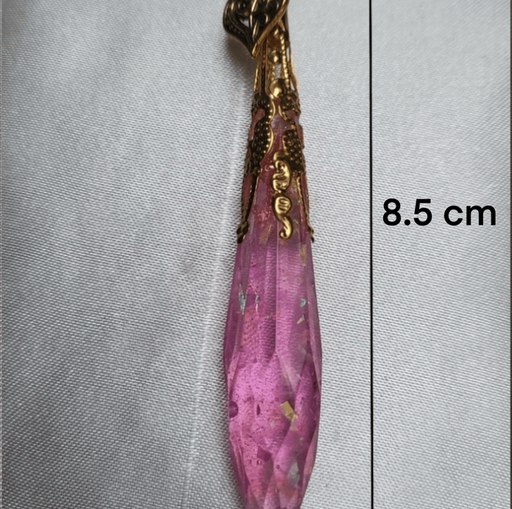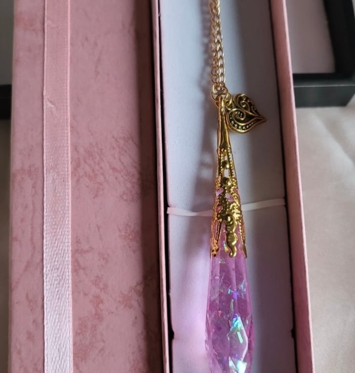 This cute pink crystal necklace is a perfect gift for anyone who loves pink and shiny things. Its a beautiful bright shiny pink crystal with a stunning royal themed gold metal cap and an adorable gold metal heart charm.
